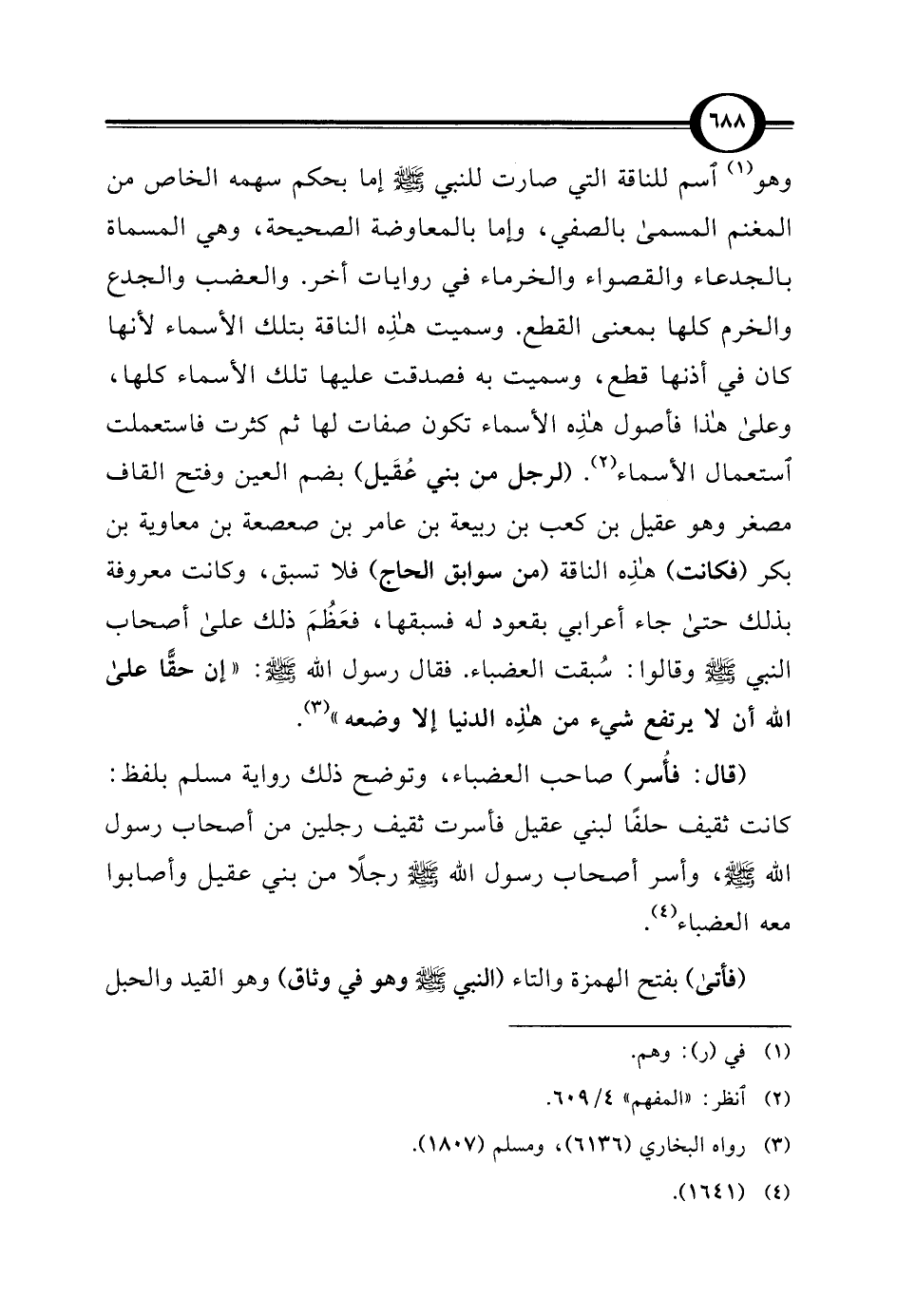 وهو (¬1) اسم للناقة التي صارت للنبي - صلى الله عليه وسلم - إما بحكم سهمه الخاص من المغنم المسمى بالصفي، وإما بالمعاوضة الصحيحة، وهي المسماة بالجدعاء والقصواء والخرماء في روايات أخر. والعضب والجدع والخرم كلها بمعنى القطع. وسميت هذِه الناقة بتلك الأسماء لأنها كان في أذنها قطع، وسميت به فصدقت عليها تلك الأسماء كلها، وعلى هذا فأصول هذِه الأسماء تكون صفات لها ثم كثرت فاستعملت استعمال الأسماء (¬2). (لرجل من بني عُقَيل) بضم العين وفتح القاف مصغر وهو عقيل بن كعب بن ربيعة بن عامر بن صعصعة بن معاوية بن بكر (فكانت) هذِه الناقة (من سوابق الحاج) فلا تسبق، وكانت معروفة بذلك حتى جاء أعرابي بقعود له فسبقها، فعَظُمَ ذلك على أصحاب النبي - صلى الله عليه وسلم - وقالوا: سُبقت العضباء. فقال رسول الله - صلى الله عليه وسلم -: "إن حقًّا على الله أن لا يرتفع شيء من هذِه الدنيا إلا وضعه" (¬3).