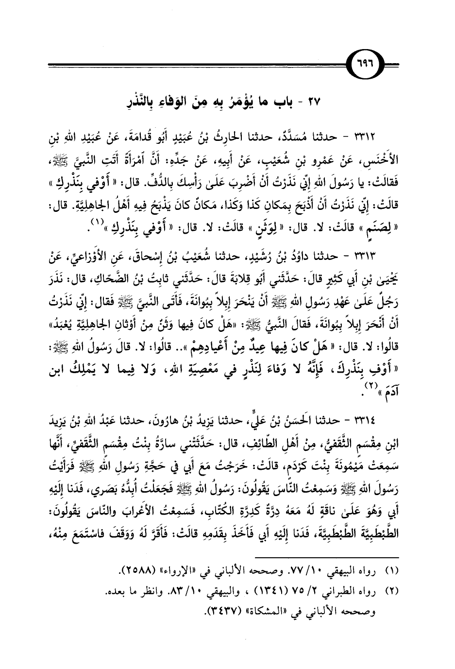 3312 - حدثنا مُسَدَّدٌ، حدثنا الحارِثُ بْنُ عُبَيْدٍ أَبُو قُدامَةَ، عَنْ عُبَيْدِ اللهِ بْنِ الأَخْنَسِ، عَنْ عَمْرِو بْنِ شعَيبٍ، عَنْ أَبِيهِ، عَنْ جَدِّهِ: أَنَّ امْرَأَةً أَتَتِ النَّبيَّ - صلى الله عليه وسلم -، فَقالَتْ: يا رَسُولَ اللهِ إِنّي نَذَرْتُ أَنْ أَضْرِبَ عَلَى رَأْسِكَ بِالدُّفِّ. قال: " أَوْفي بِنَذْرِكِ" قالَتْ: إِنّي نَذَرْت أَنْ أَذْبَحَ بِمَكانِ كَذا وَكَذا، مَكانٌ كانَ يَذْبَحُ فِيهِ أَهْل الجاهِلِيَّةِ. قال: "لِصَنَمٍ" قالَتْ: لا. قال: "لِوَثَنٍ" قالَتْ: لا. قال: "أَوْفي بِنَذْرِكِ" (¬1).