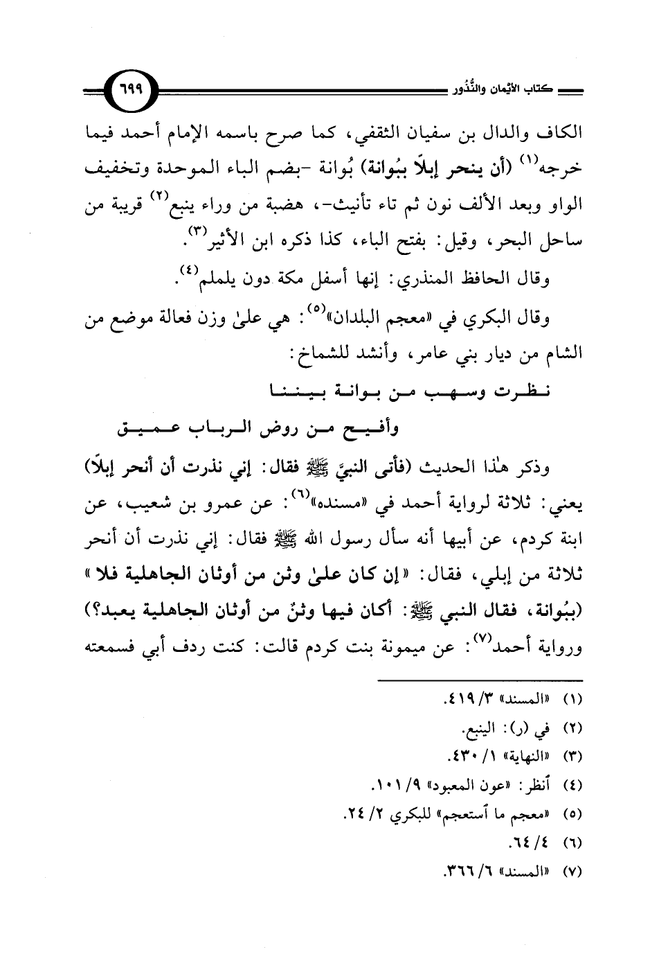 وذكر هذا الحديث (فأتى النبيَّ - صلى الله عليه وسلم - فقال: إني نذرت أن أنحر إبلاً) يعني: ثلاثة لرواية أحمد في "مسنده" (¬6): عن عمرو بن شعيب، عن ابنة كردم، عن أبيها أنه سأل رسول الله - صلى الله عليه وسلم - فقال: إني نذرت أن أنحر ثلاثة من إبلي، فقال: "إن كان على وثن من أوثان الجاهلية فلا" (ببُوانة، فقال النبي - صلى الله عليه وسلم -: أكان فيها وثنٌ من أوثان الجاهلية يعبد؟ ) ورواية أحمد (¬7): عن ميمونة بنت كردم قالت: كنت ردف أبي فسمعته