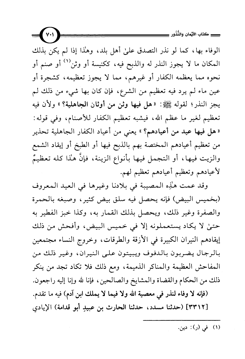 الوفاء بها، كما لو نذر التصدق على أهل بلد، وهذا إذا لم يكن بذلك المكان ما لا يجوز النذر له والذبح فيه، ككنيسة أو وثن (¬1) أو صنم أو نحوه مما يعظمه الكفار أو غيرهم، مما لا يجوز تعظيمه، كشجرة أو عين ماء لم يرد فيه تعظيم من الشرع، فإن كان بها شيء من ذلك لم يجز النذر؛ لقوله - صلى الله عليه وسلم -: "هل فيها وثن من أوثان الجاهلية؟ " ولأن فيه تعظيم لغير ما عظم الله، فيشبه تعظيم الكفار للأصنام، وفي قوله: "هل فيها عيد من أعيادهم؟ " يعني من أعياد الكفار الجاهلية تحذير من تعظيم أعيادهم المختصة بهم بالذبح فيها أو الطبخ أو إيقاد الشمع والزيت فيها، أو التجمل فيها بأنواع الزينة، فإنَّ هذا كله تعظيمٌ لأعيادهم وتعظيم أعيادهم تعظيم لهم.