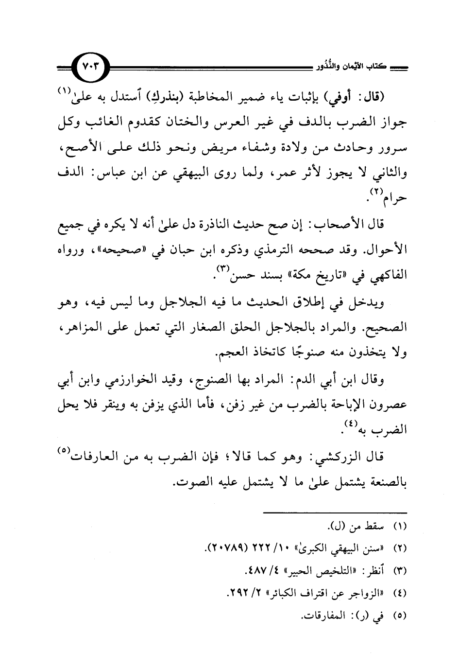 (قال: أوفي) بإثبات ياء ضمير المخاطبة (بنذركِ) استدل به على (¬1) جواز الضرب بالدف في غير العرس والختان كقدوم الغائب وكل سرور وحادث من ولادة وشفاء مريض ونحو ذلك على الأصح، والثاني لا يجوز لأثر عمر، ولما روى البيهقي عن ابن عباس: الدف حرام (¬2).