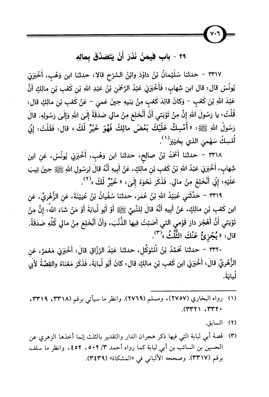 3317 - حدثنا سُلَيْمان بْنُ داوُدَ وابْنُ السَّرْحِ قالا: حدثنا ابن وَهْبٍ، أَخْبَرَني يُونُسُ قال: قال ابن شِهاب: فَأَخْبَرَني عَبْدُ الرَّحْمَنِ بْن عَبْدِ اللهِ بْنِ كعْبِ بْنِ مالِكٍ أَنَّ عَبْدَ اللهِ بْنَ كَعْبٍ - وَكانَ قائِدَ كَعْبٍ مِنْ بَنِيهِ حِينَ عَميَ- عَنْ كَعْبِ بْنِ مالِكٍ قال: قُلْتُ: يا رَسُولَ اللهِ إِنَّ مِنْ تَوْبَتي أَنْ أَنْخَلِعَ مِنْ مالي صَدَقَةً إِلَى اللهِ وَإِلَى رَسُولِهِ. قالَ رَسُول اللهِ - صلى الله عليه وسلم -: "أَمْسِكْ عَلَيْكَ بَعْضَ مالِكَ فَهُوَ خَيْر لَكَ" قال: فَقُلْتُ: إِنّي أُمْسِكُ سَهْميَ الذي بِخَيْبَرَ (¬1).