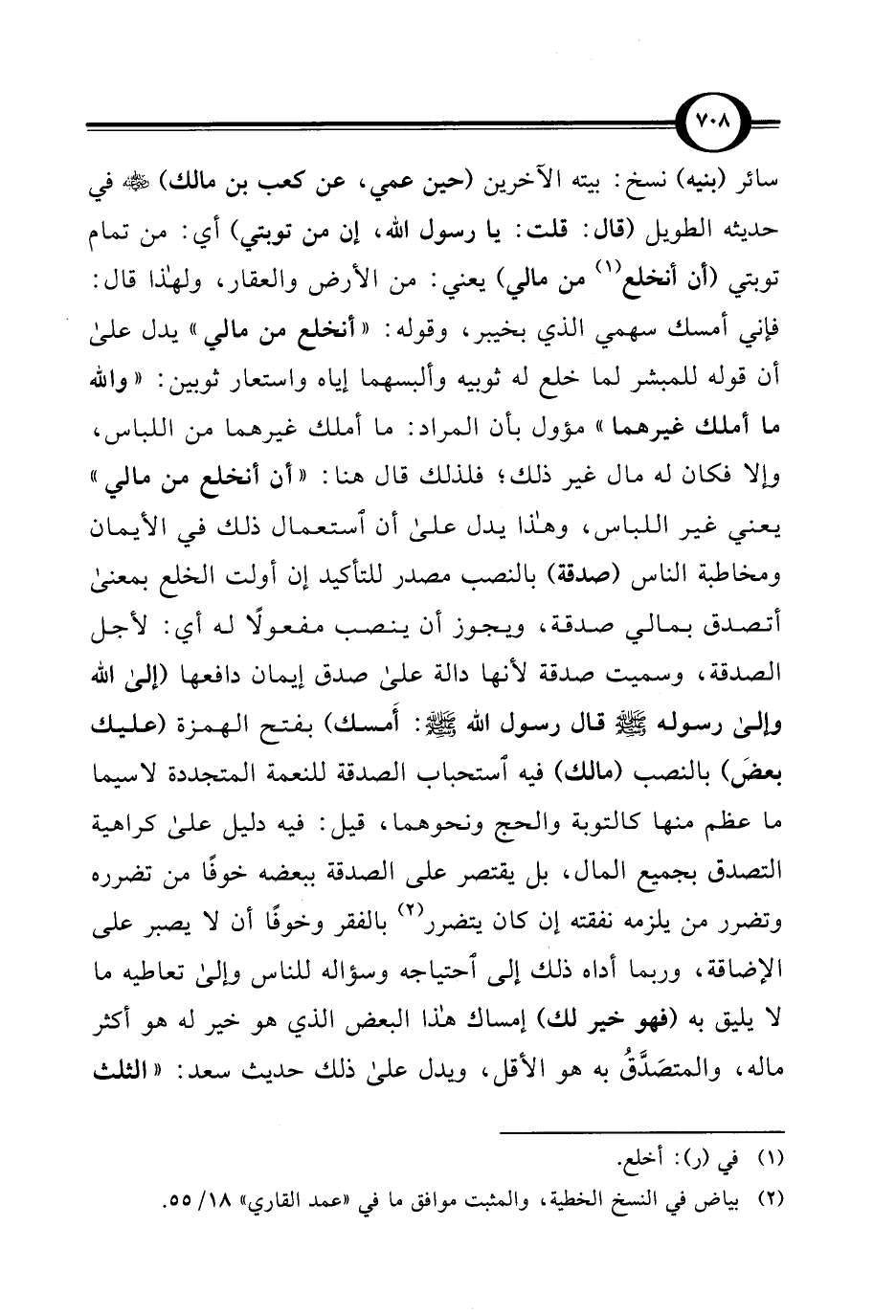 سائر (بنيه) نسخ: بيته الآخرين (حين عمي، عن كعب بن مالك) -رضي الله عنه- في حديثه الطويل (قال: قلت: يا رسول الله، إن من توبتي) أي: من تمام توبتي (أن أنخلع (¬1) من مالي) يعني: من الأرض والعقار، ولهذا قال: فإني أمسك سهمي الذي بخيبر، وقوله: "أنخلع من مالي" يدل على أن قوله للمبشر لما خلع له ثوبيه وألبسهما إياه واستعار ثوبين: " والله ما أملك غيرهما " مؤول بأن المراد: ما أملك غيرهما من اللباس، وإلا فكان له مال غير ذلك؛ فلذلك قال هنا: "أن أنخلع من مالي" يعني غير اللباس، وهذا يدل على أن استعمال ذلك في الأيمان ومخاطبة الناس (صدقة) بالنصب مصدر للتأكيد إن أولت الخلع بمعنى أتصدق بمالي صدقة، ويجوز أن ينصب مفعولًا له أي: لأجل الصدقة، وسميت صدقة لأنها دالة على صدق إيمان دافعها (إلى الله وإلى رسوله - صلى الله عليه وسلم - قال رسول الله - صلى الله عليه وسلم -: أَمسك) بفتح الهمزة (عليك بعضَ) بالنصب (مالك) فيه استحباب الصدقة للنعمة المتجددة لاسيما ما عظم منها كالتوبة والحج ونحوهما، قيل: فيه دليل على كراهية التصدق بجميع المال، بل يقتصر على الصدقة ببعضه خوفًا من تضرره وتضرر من يلزمه نفقته إن كان يتضرر (¬2) بالفقر وخوفًا أن لا يصبر على الإضاقة، وربما أداه ذلك إلى احتياجه وسؤاله للناس وإلى تعاطيه ما لا يليق به (فهو خير لك) إمساك هذا البعض الذي هو خير له هو أكثر ماله، والمتصَدَّقُ به هو الأقل، ويدل على ذلك حديث سعد: " الثلث