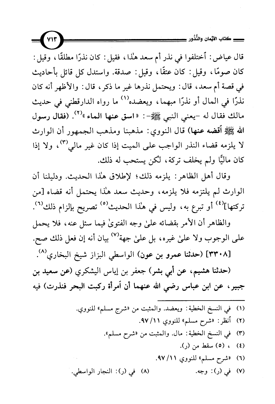 (فقال: إن أمي ماتت) وأمه: عمرة بنت مسعود بن قيس من بني النجار من المبايعات، توفيت سنة خمس من الهجرة (¬4). (وعليها نذر لم تقضه)
