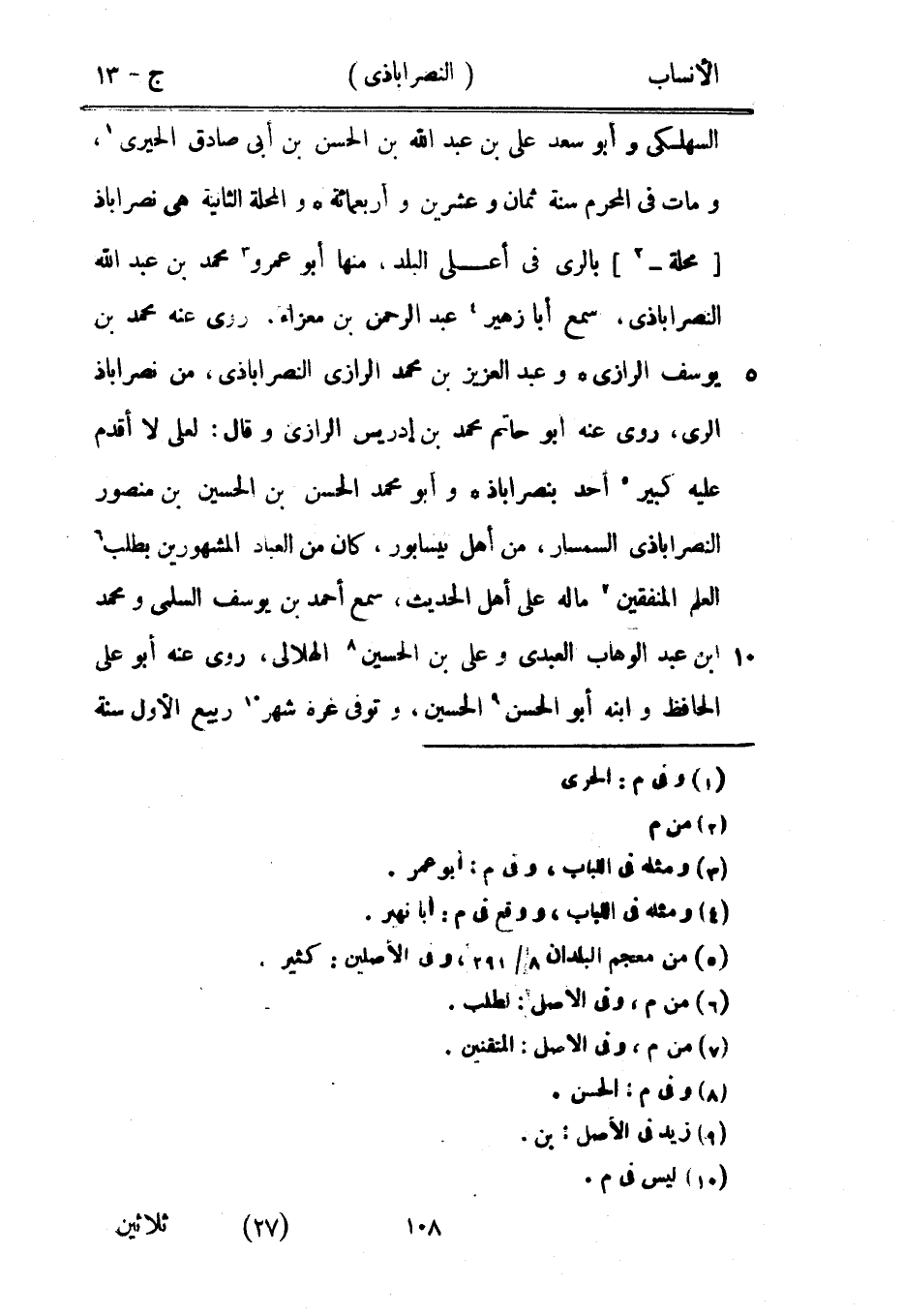 السهلكى وأبو سعد على بن عبد الله بن الحسن بن أبى صادق الحيريّ [1] ، ومات في المحرم سنة ثمان وعشرين وأربعمائة والمحلة الثانية هي نصراباذ [محلة-[2]] بالري في أعلى البلد، منها أبو عمرو [3] محمد بن عبد الله النصرآباذيّ، سمع أبا زهير [4] عبد الرحمن بن معزاء، روى عنه محمد بن يوسف الرازيّ وعبد العزيز بن محمد الرازيّ النصرآباذيّ، من نصراباذ الري، روى عنه أبو حاتم محمد بن إدريس الرازيّ وقال: لعلى لا أقدم عليه كبير [5] أحد بنصراباذ وأبو محمد الحسن بن الحسين بن منصور النصرآباذيّ السمسار، من أهل نيسابور، كان من العباد المشهورين بطلب [6] العلم المنفقين [7] ماله على أهل الحديث، سمع أحمد بن يوسف السلمي ومحمد ابن عبد الوهاب العبديّ وعلى بن الحسين [8] الهلالي، روى عنه أبو على الحافظ وابنه أبو الحسن [9] الحسين، وتوفى غرة شهر [10] ربيع الأول سنة