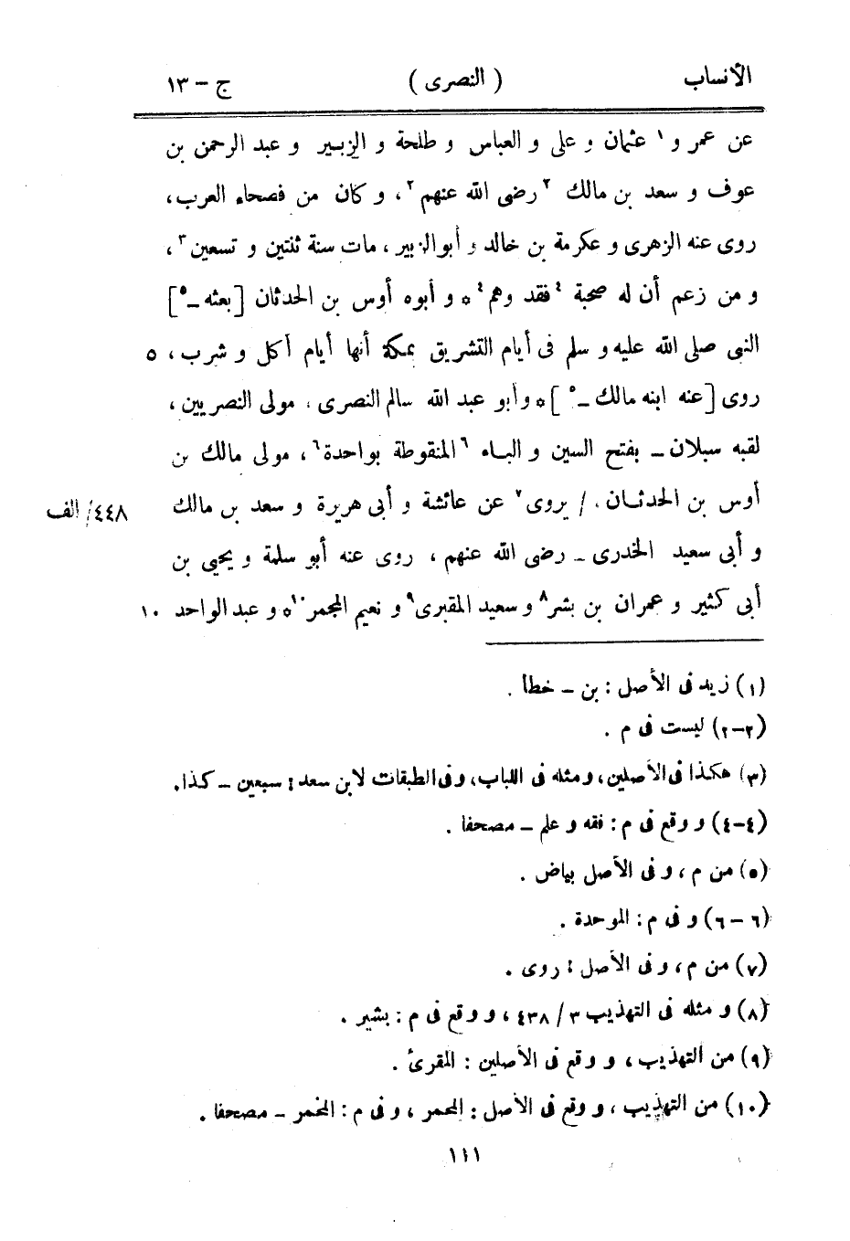 عن عمرو [1] عثمان وعلى والعباس وطلحة والزبير وعبد الرحمن بن عوف وسعد بن مالك [2] رضى الله عنهم [2] ، وكان من فصحاء العرب، روى عنه الزهري وعكرمة بن خالد وأبو الزبير، مات سنة ثنتين وتسعين [3] ، ومن زعم أن له صحبة [4] فقد وهم [4] وأبوه أوس بن الحدثان [بعثه-[5]] النبي صلى الله عليه وسلم في أيام التشريق بمكة أنها أيام أكل وشرب، روى [عنه ابنه مالك-[5]] وأبو عبد الله سالم النصري، مولى النصريين، لقبه سبلان- بفتح السين والباء [6] المنقوطة بواحدة [6] ، مولى مالك بن أوس بن الحدثان،/ يروى [7] عن عائشة وأبى هريرة وسعد بن مالك وأبى سعيد الخدريّ- رضى الله عنهم، روى عنه أبو سلمة ويحيى بن أبى كثير وعمران بن بشر [8] وسعيد المقبري [9] ونعيم المجمر [10] وعبد الواحد