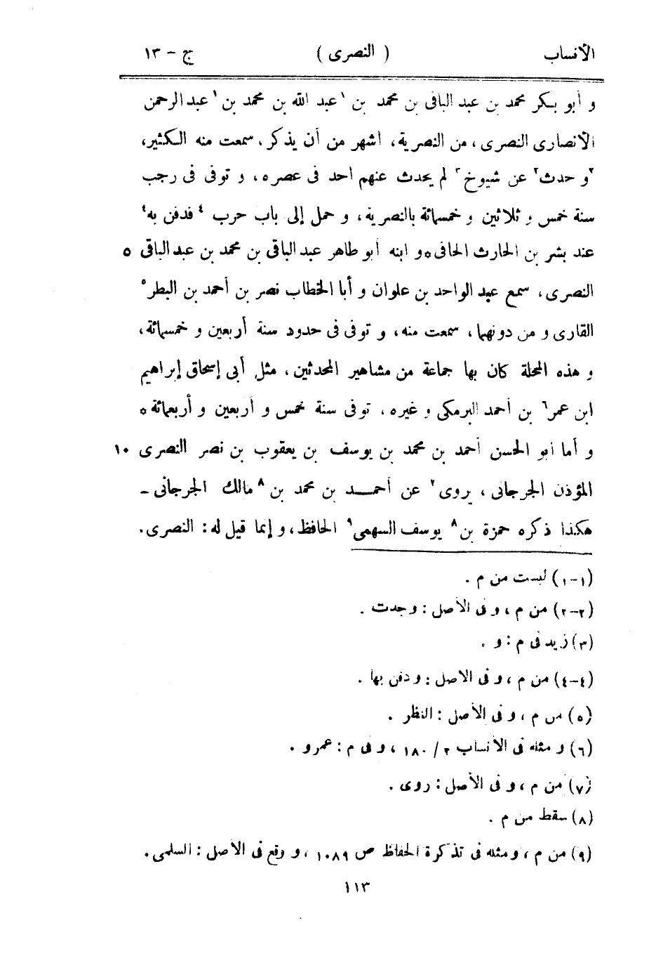 وأبو بكر محمد بن عبد الباقي بن محمد بن [1] عبد الله بن محمد بن [1] عبد الرحمن الأنصاري النصري، من النصرية، أشهر من أن يذكر، سمعت منه الكثير، [2] وحدث [2] عن شيوخ [3] لم يحدث عنهم أحد في عصره، وتوفى في رجب سنة خمس وثلاثين وخمسمائة بالنصرية، وحمل إلى باب حرب [4] فدفن به [4] عند بشر بن الحارث الحافى وابنه أبو طاهر عبد الباقي بن محمد بن عبد الباقي النصري، سمع عبد الواحد بن علوان وأبا الخطاب نصر بن أحمد بن البطر [5] القاري ومن دونهما، سمعت منه، وتوفى في حدود سنة أربعين وخمسمائة، وهذه المحلة كان بها جماعة من مشاهير المحدثين، مثل أبى إسحاق إبراهيم ابن عمر [6] بن أحمد البرمكي وغيره، توفى سنة خمس وأربعين وأربعمائة وأما أبو الحسن أحمد بن محمد بن يوسف بن يعقوب بن نصر النصري المؤذن الجرجاني، يروى [7] عن أحمد بن محمد بن [8] مالك الجرجاني- هكذا ذكره حمزة بن [8] يوسف السهمي [9] الحافظ، وإنما قيل له: النصري،