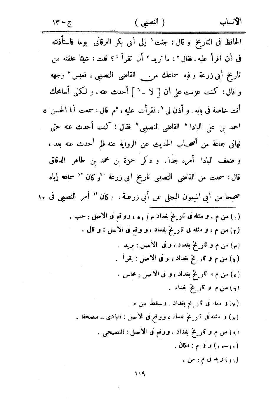 الحافظ في التاريخ وقال: جئت [1] إلى أبى بكر البرقاني يوما فاستأذنته في أن أقرأ عليه، فقال [2] : ما تريد [3] أن تقرأ [4] ؟ قلت: شيئا علقته من تاريخ أبى زرعة وفيه سماعك من القاضي النصيبي، فعبس [5] وجهه وقال: كنت عزمت على أن [لا-[6]] أحدث عنه، ولكنى أسامحك أنت خاصة في بابه، وأذن لي [7] ، فقرأت عليه، ثم قال: سمعت أبا الحسن احمد بن على البادا [8] القاضي النصيبي [9] فقال: كنت أحدث عنه حتى نهاني جماعة من أصحاب الحديث عن الرواية عنه فلم أحدث عنه بعد، وضعف البادا أمره جدا، وذكره حمزة بن محمد بن طاهر الدقاق قال: سمعت من القاضي النصيبي تاريخ ابى زرعة [10] وكان [10] سماعه إياه صحيحا من أبى الميمون البجلي عن أبى زرعة، وكان [11] أمر النصيبي في