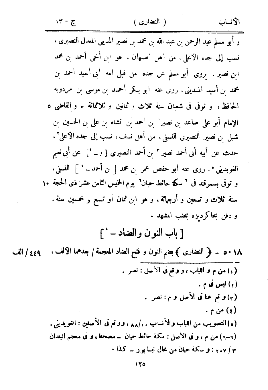 وأبو مسلم عبد الرحمن بن عبد الله بن محمد بن نصير المديني المعدل النصيري، نسب إلى جده الأعلى، من أهل أصبهان، هو ابن أخى أحمد بن محمد ابن نصير، يروى أبو مسلم عن جده من قبل أمه أبى أسيد أحمد بن محمد بن أسيد المديني، روى عنه أبو بكر أحمد بن موسى بن مردويه الحافظ، وتوفى في شعبان سنة ثلاث وثمانين وثلاثمائة والقاضي الإمام أبو على صاعد بن نصير [1] بن أحمد بن الشاه بن على بن الحسين بن شبل بن نصير النصيري النسفي، من أهل نسف، نسب إلى جده الأعلى [2] ، حدث عن أبيه أبى أحمد نصير [3] بن أحمد النصيري [و-[4]] عن أبى نعيم الغوبدينى [5] ، روى عنه أبو حفص عمر بن محمد [بن أحمد-[4]] النسفي، وتوفى بسمرقند في [6] سكة حائط حبان [6] يوم الخميس الثامن عشر ذي الحجة سنة ثلاث وتسعين وأربعمائة، وهو ابن ثمان أو تسع وخمسين سنة، ودفن بجاكرديزه يجنب المشهد.