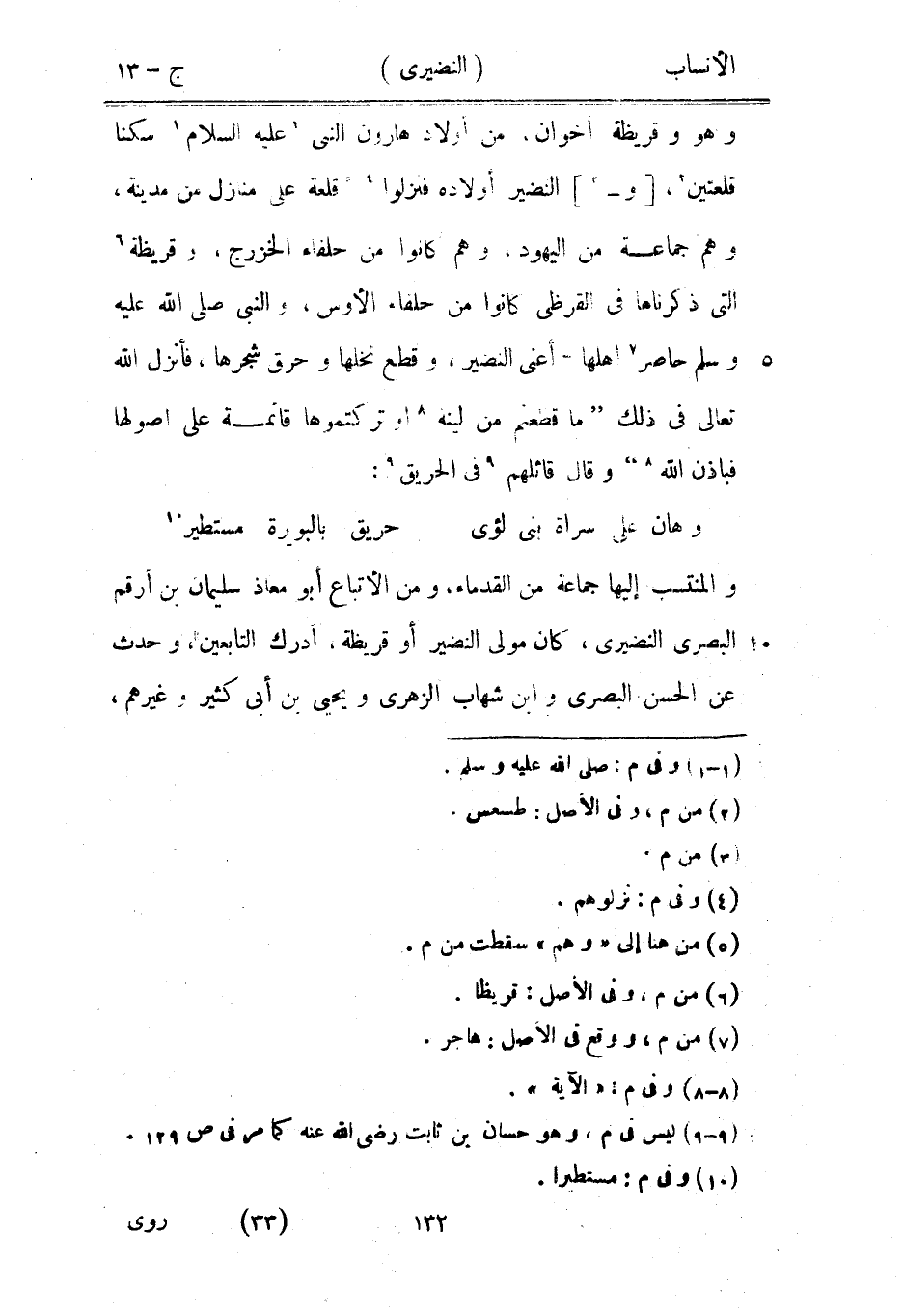وهو وقريظة أخوان، من أولاد هارون النبي [1] عليه السلام [1] سكنا قلعتين [2] ، [و-[3]] النضير أولاده فنزلوا [4] [5] قلعة على منازل من مدينة، وهم جماعة من اليهود، وهم كانوا من حلفاء الخزرج، وقريظة [6] التي ذكرناها في القرظي كانوا من خلفاء الأوس، والنبي صلى الله عليه وسلم حاصر [7] أهلها- أعنى النضير، وقطع نخلها وحرق شجرها، فأنزل الله تعالى في ذلك ما قَطَعْتُمْ من لِينَةٍ [8] أَوْ تَرَكْتُمُوها قائِمَةً عَلى أُصُولِها فَبِإِذْنِ الله 59: 5 [8] وقال قائلهم [9] في الحريق [9] :