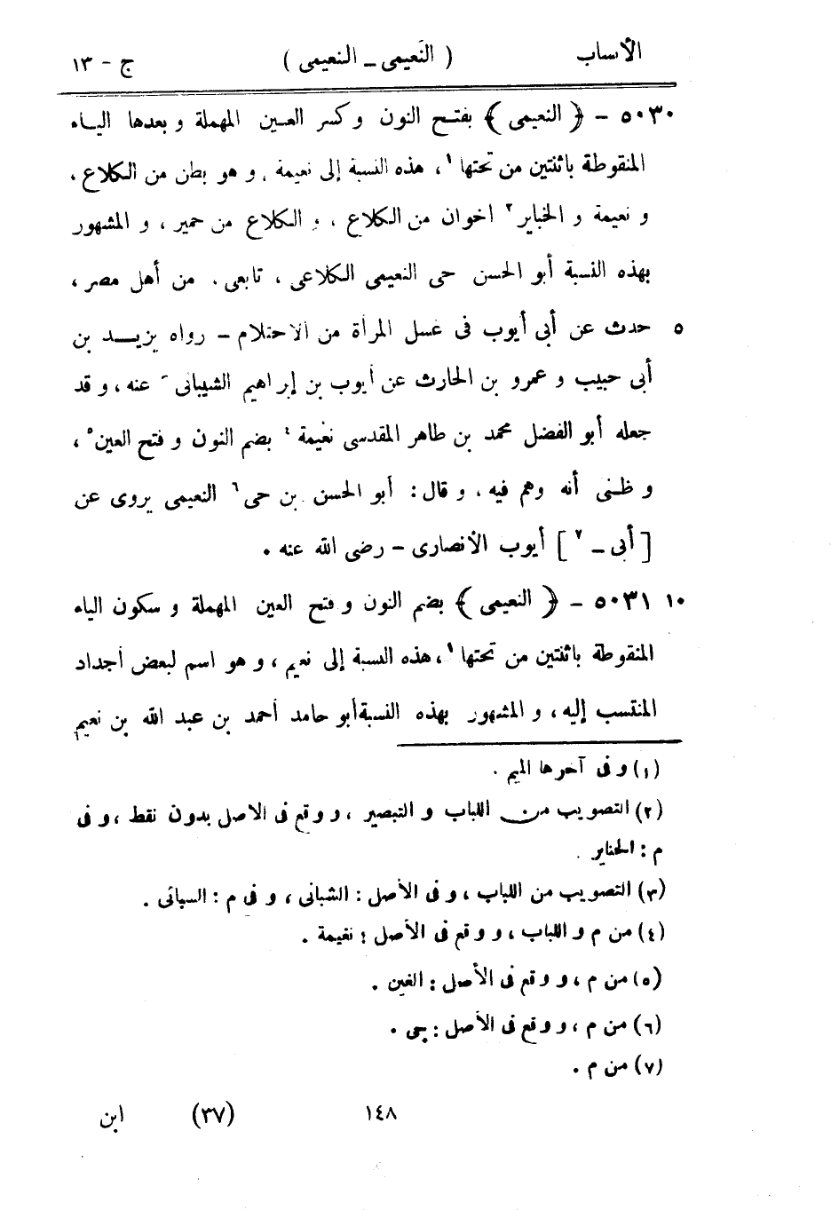 بفتح النون وكسر العين المهملة وبعدها الياء المنقوطة باثنتين من تحتها [1] ، هذه النسبة إلى نعيمة، وهو بطن من الكلاع، ونعيمة والخبائر [2] اخوان من الكلاع، والكلاع من حمير، والمشهور بهذه النسبة أبو الحسن حي النعيمي الكلاعي، تابعي، من أهل مصر، حدث عن أبى أيوب في غسل المرأة من الاحتلام- رواه يزيد بن أبى حبيب وعمرو بن الحارث عن أيوب بن إبراهيم الشيباني [3] عنه، وقد جعله أبو الفضل محمد بن طاهر المقدسي نعيمة [4] بضم النون وفتح العين [5] ، وظني أنه وهم فيه، وقال: أبو الحسن بن حي [6] النعيمي يروى عن [أبى-[7]] أيوب الأنصاري- رضى الله عنه.