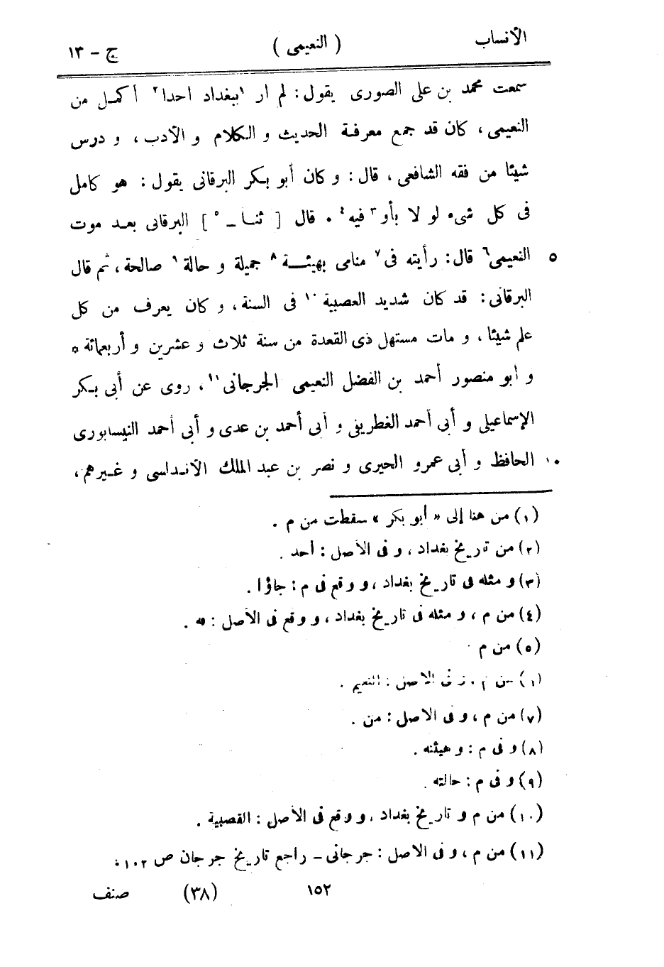 سمعت محمد بن على الصوري يقول: لم أر [1] ببغداد أحدا [2] أكمل من النعيمي، كان قد جمع معرفة الحديث والكلام والأدب، ودرس شيئا من فقه الشافعيّ، قال: وكان أبو بكر البرقاني يقول: هو كامل في كل شيء لولا بأو [3] فيه [4] . قال [ثنا-[5]] البرقاني بعد موت النعيمي [6] قال: رأيته في [7] منامي بهيئة [8] جميلة وحالة [9] صالحة، ثم قال البرقاني: قد كان شديد العصبية [10] في السنة، وكان يعرف من كل علم شيئا، ومات مستهل ذي القعدة من سنة ثلاث وعشرين وأربعمائة وأبو منصور أحمد بن الفضل النعيمي الجرجاني [11] ، روى عن أبى بكر الإسماعيلي وأبى أحمد الغطريفى وأبى أحمد بن عدي وأبى أحمد النيسابورىّ الحافظ وأبى عمرو الحيريّ ونصر بن عبد الملك الأندلسى وغيرهم،
