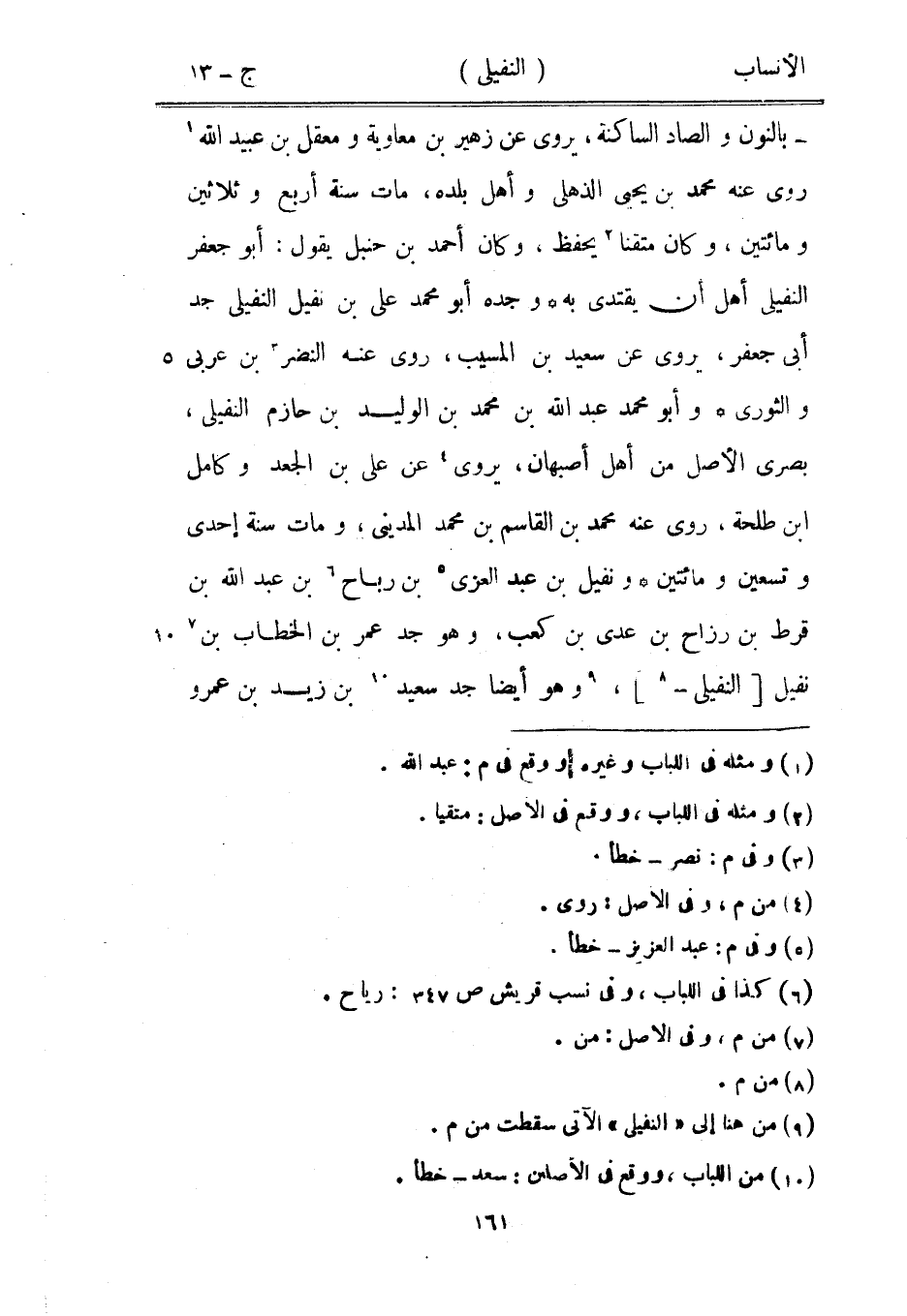 - بالنون والصاد الساكنة، يروى عن زهير بن معاوية ومعقل بن عبيد الله [1] روى عنه محمد بن يحيى الذهلي وأهل بلده، مات سنة أربع وثلاثين ومائتين، وكان متقنا [2] يحفظ، وكان أحمد بن حنبل يقول: أبو جعفر النفيلى أهل أن يقتدى به وجده أبو محمد على بن نفيل النفيلى جد أبى جعفر، يروى عن سعيد بن المسيب، روى عنه النضر [3] بن عربي والثوري وأبو محمد عبد الله بن محمد بن الوليد بن حازم النفيلى، بصرى الأصل من أهل أصبهان، يروى [4] عن على بن الجعد وكامل ابن طلحة، روى عنه محمد بن القاسم بن محمد المديني، ومات سنة إحدى وتسعين ومائتين ونفيل بن عبد العزى [5] بن رباح [6] بن عبد الله بن قرط بن رزاح بن عدي بن كعب، وهو جد عمر بن الخطاب بن [7] نفيل [النفيلى-[8]] ، [9] وهو أيضا جد سعيد [10] بن زيد بن عمرو