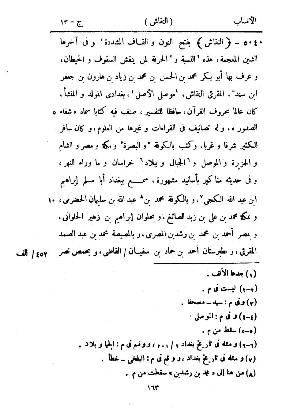 بفتح النون والقاف المشددة [1] وفي آخرها الشين المعجمة، هذه [2] النسبة و [2] الحرفة لمن ينقش السقوف والحيطان، وعرف بها أبو بكر محمد بن الحسن بن محمد بن زياد بن هارون بن جعفر ابن سند [3] ، المقرئ النقاش، [4] موصلى الأصل [4] ، بغدادي المولد والمنشأ، كان عالما بحروف القرآن، حافظا للتفسير، صنف فيه كتابا سماه «شفاء الصدور» ، وله تصانيف في القراءات وغيرها من العلوم، وكان سافر الكثير شرقا وغربا، وكتب بالكوفة [5] والبصرة [5] ومكة ومصر والشام والجزيرة والموصل و [6] الجبال وببلاد [6] خراسان وما وراء النهر، وفي حديثه مناكير بأسانيد مشهورة، سمع ببغداد أبا مسلم إبراهيم ابن عبد الله الكجي [7] ، وبالكوفة محمد بن [8] عبد الله بن سليمان الحضرميّ، وبمكة محمد بن على بن زيد الصائغ، وبحلوان إبراهيم بن زهير الحلواني، وبمصر أحمد بن محمد بن رشدين المصري، وبالمصيصة محمد بن عبد الصمد المقرئ، وبطبرستان أحمد بن حماد بن سفيان/ القاضي، وبحمص نصر