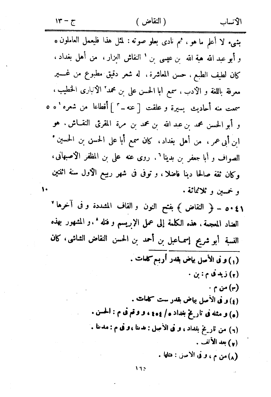 بفتح النون والقاف المشددة وفي آخرها [7] الضاد المعجمة، هذه الكلمة إلى عمل الإبريسم وفتله [8] ، والمشهور بهذه النسبة أبو شريح إسماعيل بن أحمد بن الحسن النقاض الشاشي، كان