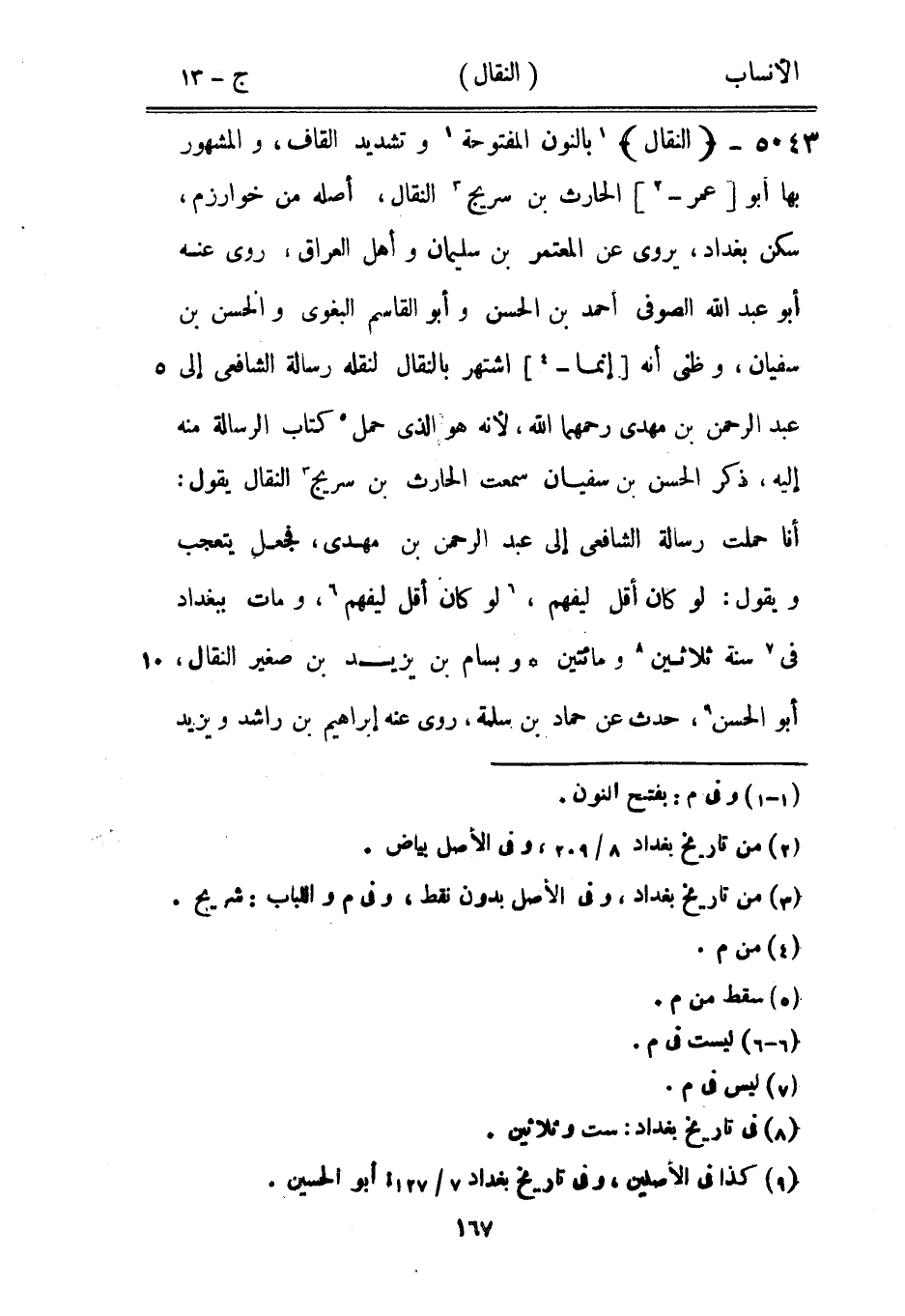 [1] بالنون المفتوحة [1] وتشديد القاف، والمشهور بها أبو [عمر-[2]] الحارث بن سريج [3] النقال، أصله من خوارزم، سكن بغداد، يروى عن المعتمر بن سليمان وأهل العراق، روى عنه أبو عبد الله الصوفي أحمد بن الحسن وأبو القاسم البغوي والحسن بن سفيان، وظني أنه [إنما-[4]] اشتهر بالنقال لنقله رسالة الشافعيّ إلى عبد الرحمن بن مهدي رحمهما الله، لأنه هو الّذي حمل [5] كتاب الرسالة منه إليه، ذكر الحسن بن سفيان سمعت الحارث بن سريج [3] النقال يقول: