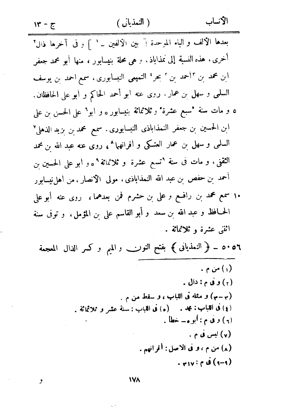 بعدها الألف والباء الموحدة [بين الألفين-[1]] وفي آخرها ذال [2] أخرى، هذه النسبة إلى نمذاباذ، وهي محلة نيسابور، منها أبو محمد جعفر ابن محمد بن [3] أحمد بن [3] بحر [4] التميمي النيسابورىّ، سمع احمد بن يوسف السلمي وسهل بن عمار، روى عنه أبو أحمد الحاكم وأبو على الحافظان، ومات سنة [5] سبع عشرة [5] وثلاثمائة بنيسابور وابو [6] على الحسن بن على ابن الحسين بن جعفر النمذاباذى النيسابورىّ، سمع محمد بن يزيد الذهلي [7] السلمي وسهل بن عمار العتكيّ وأقرانهما [8] ، روى عنه عبد الله بن محمد الثقفي، ومات في سنة [9] تسع عشرة وثلاثمائة [9] وأبو على الحسين بن أحمد بن حفص بن عبد الله النمذاباذى، مولى الأنصار، من أهل نيسابور سمع محمد بن رافع وعلى بن حشرم فمن بعدهما، روى عنه أبو على الحافظ وعبد الله بن سعد وأبو القاسم على بن المؤمل، وتوفى سنة اثنتي عشرة وثلاثمائة.