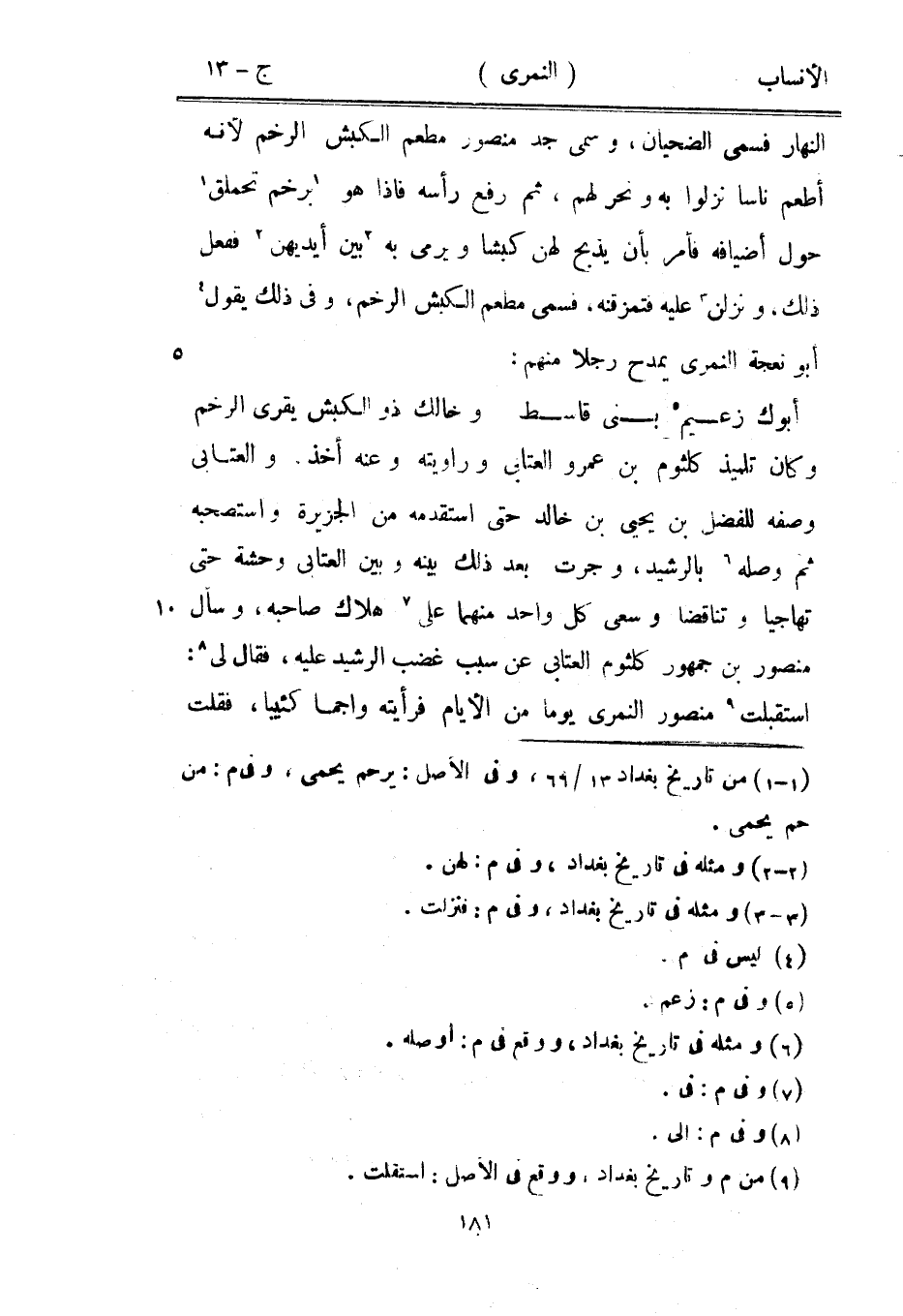 النهار فسمى الضحيان، وسمى جد منصور مطعم الكبش الرخم لأنه أطعم ناسا نزلوا به ونحر لهم، ثم رفع رأسه فإذا هو [1] برخم تحملق [1] حول أضيافه فأمر بأن يذبح لهن كبشا ويرمى به [2] بين أيديهن [2] ففعل ذلك، ونزلن [3] عليه فتمزقنه، فسمى مطعم الكبش الرخم، وفي ذلك يقول [4] أبو نعجة النمري يمدح رجلا منهم: