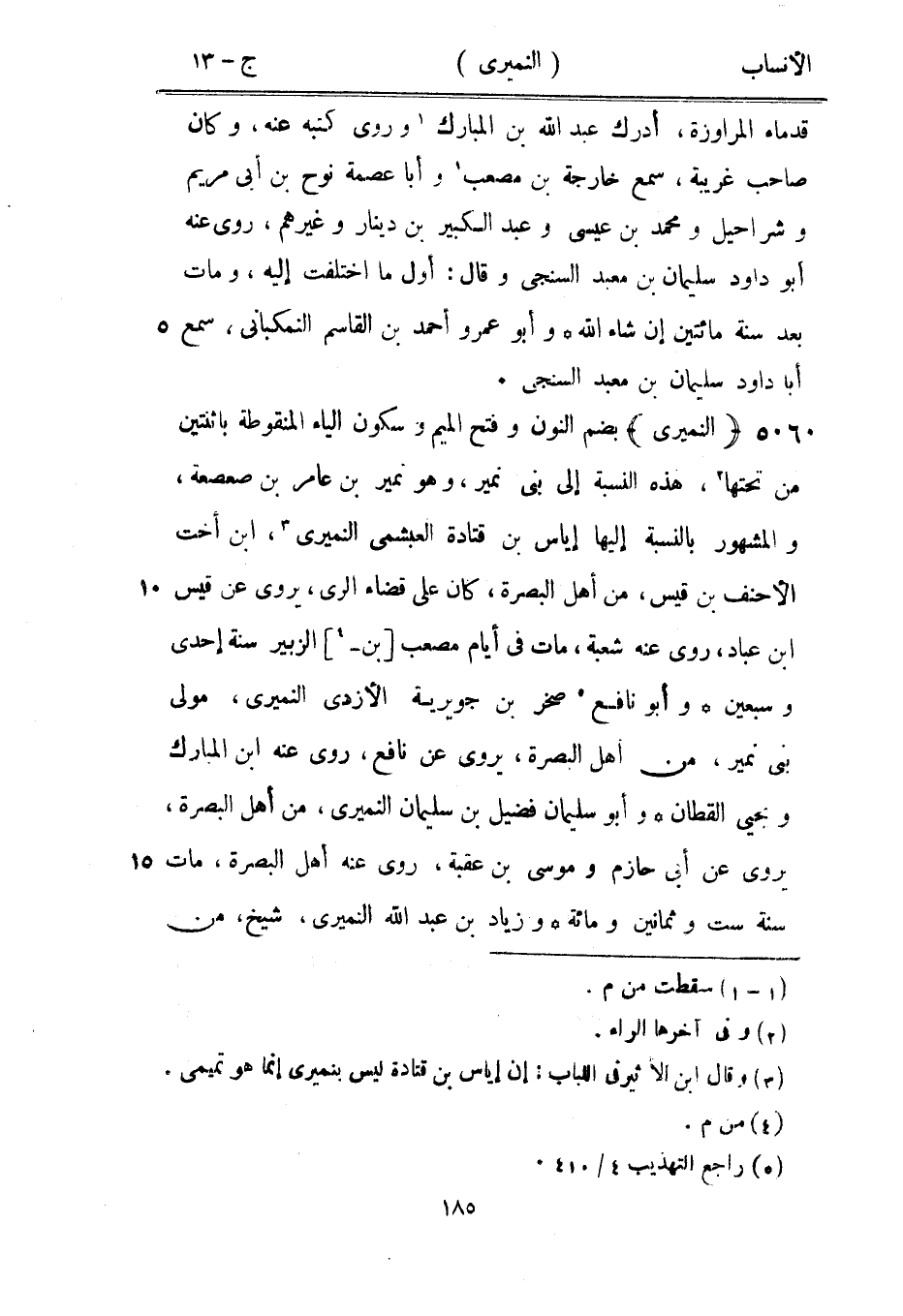 بضم النون وفتح الميم وسكون الياء المنقوطة باثنتين من تحتها [2] ، هذه النسبة إلى بنى نمير، وهو نمير بن عامر بن صعصعة، والمشهور بالنسبة إليها إياس بن قتادة العبشمي النميري [3] ، ابن أخت الأحنف بن قيس، من أهل البصرة، كان على قضاء الري، يروى عن قيس ابن عباد، روى عنه شعبة، مات في أيام مصعب [بن-[4]] الزبير سنة إحدى وسبعين وأبو نافع [5] صخر بن جويرية الأزدي النميري، مولى بنى نمير، من أهل البصرة، يروى عن نافع، روى عنه ابن المبارك ويحيى القطان وأبو سليمان فضيل بن سليمان النميري، من أهل البصرة، يروى عن أبى حازم وموسى بن عقبة، روى عنه أهل البصرة، مات سنة ست وثمانين ومائة وزياد بن عبد الله النميري، شيخ، من