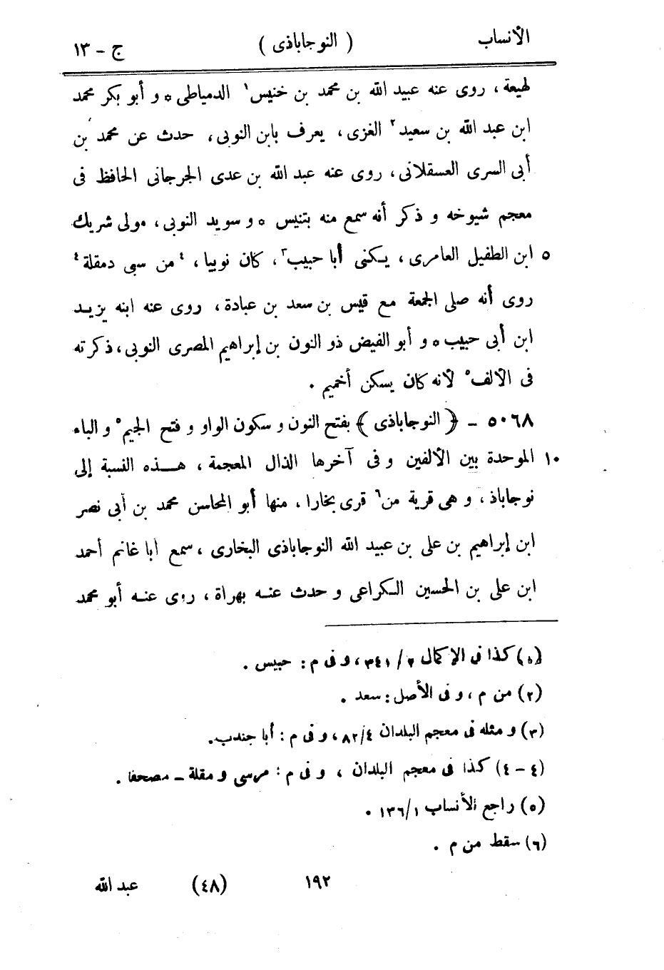 بفتح النون وسكون الواو وفتح الجيم [5] والباء الموحدة بين الألفين وفي آخرها الذال المعجمة، هذه النسبة إلى نوجاباذ، وهي قرية من [6] قرى بخارا، منها أبو المحاسن محمد بن أبى نصر ابن إبراهيم بن على بن عبيد الله النوجاباذى البخاري، سمع أبا غانم أحمد ابن على بن الحسين الكراعي وحدث عنه بهراة، روى عنه أبو محمد