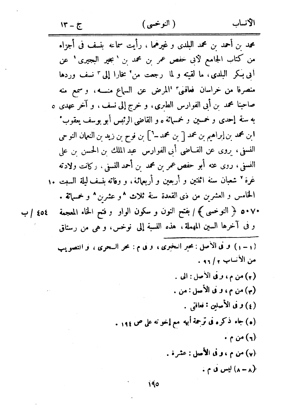 محمد بن أحمد بن محمد البلدي وغيرهما، رأيت سماعه بنسف في أجزاء من كتاب الجامع لأبى حفص عمر بن محمد بن [1] بجير البجيري [1] عن أبى بكر البلدي، ما لقيته ولما رجعت من [2] بخارا إلى [3] نسف وردها منصرفا من خراسان فعاقني [3] [4] المرض عن السماع منه، وسمع منه صاحبنا محمد بن أبى الفوارس الطبري، وخرج إلى نسف، وآخر عهدي به سنة إحدى وخمسين وخمسمائة والقاضي الرئيس أبو يوسف يعقوب [5] ابن محمد بن إبراهيم بن محمد [بن محمد-[6]] بن نوح بن زيد بن النعمان النوحى النسفي، يروى عن القاضي أبى الفوارس عبد الملك بن الحسن بن على النسفي، روى عنه أبو حفص عمر بن محمد بن أحمد النسفي، وكانت ولادته غرة [7] شعبان سنة اثنتين وأربعين وأربعمائة، ووفاته بنسف ليلة السبت الخامس والعشرين من ذي القعدة سنة ثلاث [8] وعشرين [8] وخمسمائة.