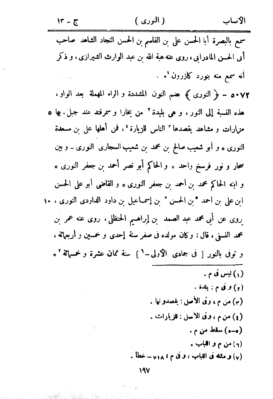 بضم النون المشددة والراء المهملة بعد الواو، هذه النسبة إلى النور، وهي بليدة [2] من بخارا وسمرقند عند جبل، بها مزارات ومشاهد يقصدها [3] الناس للزيارة [4] ، فمن أهلها على بن مسعدة النوري وأبو شعيب صالح بن محمد بن شعيب السجارى النوري- وبين سحار ونور فرسخ واحد والحاكم أبو نصر أحمد بن جعفر النوري وابنه الحاكم محمد بن أحمد بن جعفر النوري والقاضي أبو على الحسن ابن على بن أحمد [5] بن الحسن [5] بن إسماعيل بن داود الداوديّ النوري، يروى عن أبى محمد عبد الصمد بن إبراهيم الحنظليّ، روى عنه عمر بن محمد النسفي، قال: وكان مولده في صفر سنة إحدى وخمسين وأربعمائة، وتوفى بالنور [في جمادى الأولى-[6]] سنة ثمان عشرة وخمسمائة [7]