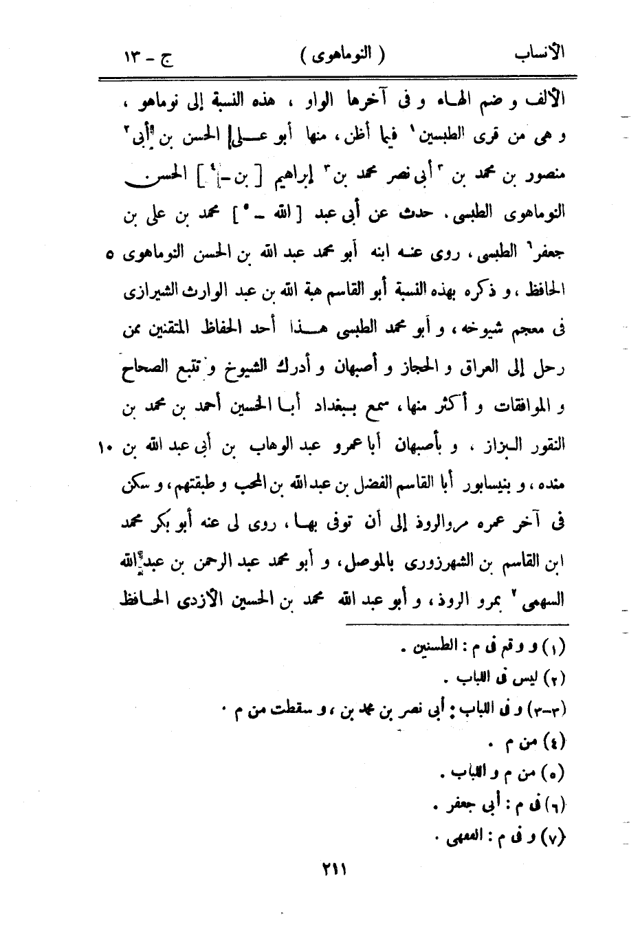 الألف وضم الهاء وفي آخرها الواو، هذه النسبة إلى نوماهو، وهي من قرى الطبسين [1] فيما أظن، منها أبو على الحسن بن أبى [2] منصور بن محمد بن [3] أبى نصر محمد بن [3] إبراهيم [بن-[4]] الحسن النوماهوى الطبسي، حدث عن أبى عبد [الله-[5]] محمد بن على بن جعفر [6] الطبسي، روى عنه ابنه أبو محمد عبد الله بن الحسن النوماهوى الحافظ، وذكره بهذه النسبة أبو القاسم هبة الله بن عبد الوارث الشيرازي في معجم شيوخه، وأبو محمد الطبسي هذا أحد الحفاظ المتقنين ممن رحل إلى العراق والحجاز وأصبهان وأدرك الشيوخ وتتبع الصحاح والموافقات وأكثر منها، سمع ببغداد أبا الحسين أحمد بن محمد بن النقور البزاز، وبأصبهان أبا عمرو عبد الوهاب بن أبى عبد الله بن مندة، وبنيسابور أبا القاسم الفضل بن عبد الله بن المحب وطبقتهم، وسكن في آخر عمره مروالروذ إلى أن توفى بها، روى لي عنه أبو بكر محمد ابن القاسم بن الشهرزوريّ بالموصل، وأبو محمد عبد الرحمن بن عبد الله السهمي [7] بمروالروذ، وأبو عبد الله محمد بن الحسين الأزدي الحافظ