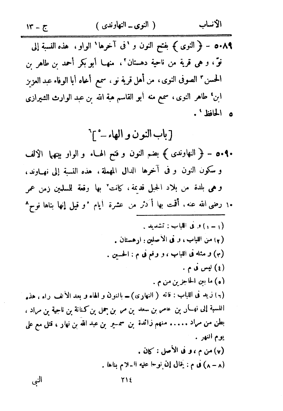 بضم النون وفتح الهاء والواو بينهما الألف وسكون النون وفي آخرها الدال المهملة، هذه النسبة إلى نهاوند، وهي بلدة من بلاد الجبل قديمة، كانت [7] بها وقعة للمسلمين زمن عمر رضى الله عنه، أقمت بها أكثر من عشرة أيام [8] وقيل إنها بناها نوح [8]