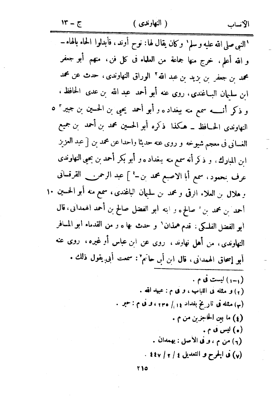 النبي صلى الله عليه وسلم [1] وكان يقال لها: نوح أوند، فأبدلوا الحاء بالهاء- والله أعلم، خرج منها جماعة من العلماء في كل فن، منهم أبو جعفر محمد بن جعفر بن يزيد بن عبد الله [2] الوراق النهاوندي، حدث عن محمد ابن سليمان الباغندي، روى عنه أبو أحمد عبد الله بن عدي الحافظ، وذكر أنه سمع منه ببغداد وأبو أحمد يحيى بن الحسين بن جبير [3] النهاوندي الحافظ- هكذا ذكره أبو الحسين محمد بن أحمد بن جميع الغساني في معجم شيوخه وروى عنه حديثا واحدا عن محمد بن [عبد العزيز ابن المبارك، وذكر أنه سمع منه ببغداد وأبو بكر أحمد بن يحيى النهاوندي عرف بمحمود، سمع أبا الإصبع محمد بن-[4]] عبد الرحمن القرقساني وهلال بن العلاء الرقى ومحمد بن سليمان الباغندي، سمع منه أبو الحسين أحمد بن محمد بن [5] صالح وابنه أبو الفضل صالح بن أحمد الهمدانيّ، قال أبو الفضل الفلكي: قدم همذان [6] وحدث بها ومن القدماء أبو المسافر النهاوندي، من أهل نهاوند، روى عن ابن عباس أو غيره، روى عنه أبو إسحاق الهمدانيّ، قال ابن أبى حاتم [7] : سمعت أبى يقول ذلك.