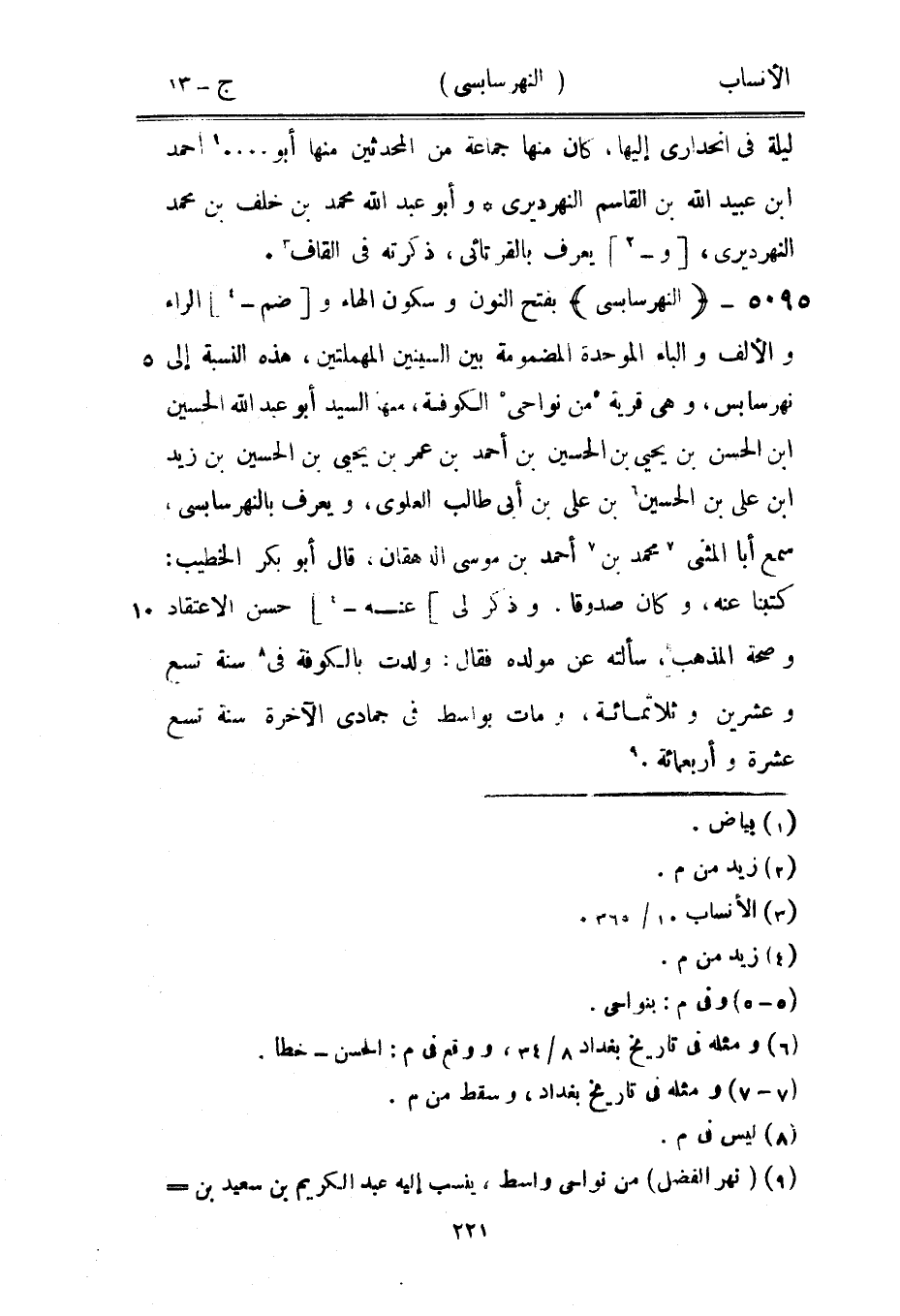 بفتح النون وسكون الهاء و [ضم-[4]] الراء والألف والباء الموحدة المضمومة بين السينين المهملتين، هذه النسبة إلى نهرسابس، وهي قرية [5] من نواحي [5] الكوفة، منها السيد أبو عبد الله الحسين ابن الحسن بن يحيى بن الحسين بن أحمد بن عمر بن يحيى بن الحسين بن زيد ابن على بن الحسين [6] بن على بن أبى طالب العلويّ، ويعرف بالنهرسابسي، سمع أبا المثنى [7] محمد بن [7] أحمد بن موسى الدهقان، قال أبو بكر الخطيب: