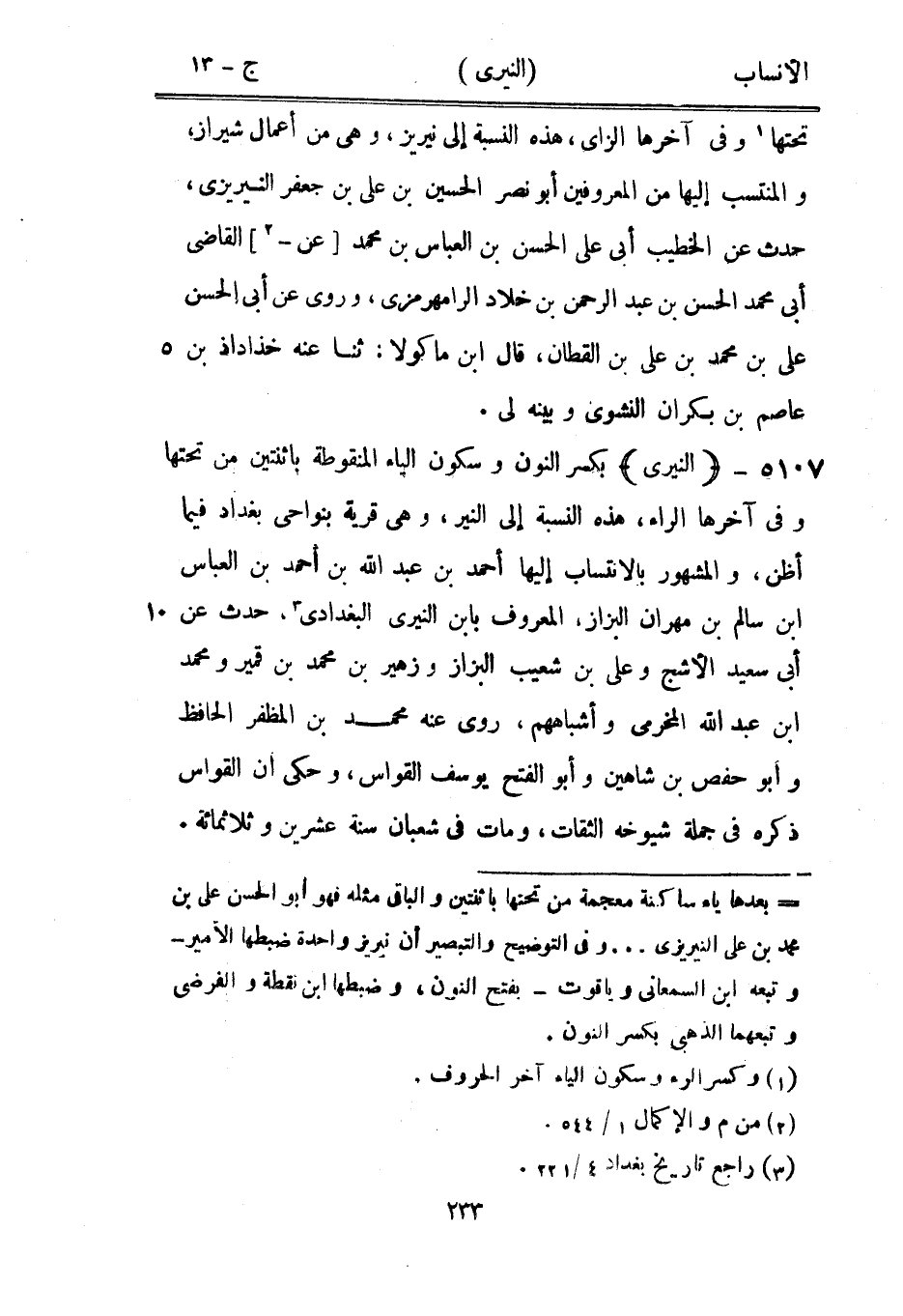 [ () ] بعدها ياء ساكنة معجمة من تحتها باثنتين والباقي مثله فهو أبو الحسن على بن محمد بن على النيريزى ... وفي التوضيح والتبصير أن نيريز واحدة ضبطها الأمير- وتبعه ابن السمعاني وياقوت- بفتح النون، وضبطها ابن نقطة والفرضيّ وتبعهما الذهبي بكسر النون.