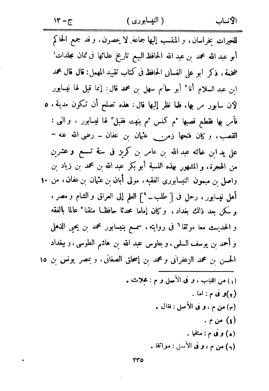 القصب، وكان فتحها زمن عثمان بن عفان- رضى الله عنه- على يد ابن خالته عبد الله بن عامر بن كريز في سنة تسع وعشرين من الهجرة، والمشهور بهذه النسبة أبو بكر عبد الله بن محمد بن زياد بن واصل بن ميمون النيسابورىّ الفقيه، مولى أبان بن عثمان بن عفان، من أهل نيسابور، رحل في [طلب-[4]] العلم إلى العراق والشام ومصر، وسكن بعد ذلك بغداد، وكان إماما محدثا حافظا متقنا [5] عالما بالفقه والحديث معا موثقا [6] في روايته، سمع بنيسابور محمد بن يحيى الذهلي وأحمد بن يوسف السلمي، وبطوس عبد الله بن هاشم الطوسي، وببغداد الحسن بن محمد الزعفرانيّ ومحمد بن إسحاق الصغاني، وبمصر يونس بن