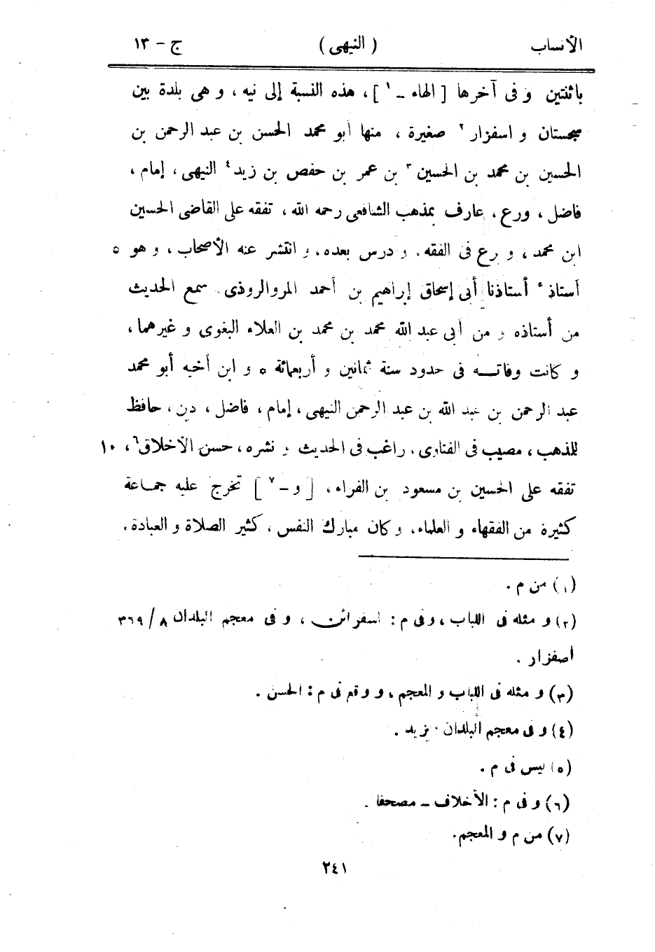 باثنتين وفي آخرها [الهاء-[1]] ، هذه النسبة إلى نيه، وهي بلدة بين سجستان وأسفزار [2] صغيرة، منها أبو محمد الحسن بن عبد الرحمن بن الحسين بن محمد بن الحسين [3] بن عمر بن حفص بن زيد [4] النيهى، إمام، فاضل، ورع، عارف بمذهب الشافعيّ رحمه الله، تفقه على القاضي الحسين ابن محمد، وبرع في الفقه، ودرس بعده، وانتشر عنه الأصحاب، وهو أستاذ [5] أستاذنا أبى إسحاق إبراهيم بن أحمد المروالروذي، سمع الحديث من أستاذه ومن أبى عبد الله محمد بن محمد بن العلاء البغوي وغيرهما، وكانت وفاته في حدود سنة ثمانين وأربعمائة وابن أخيه أبو محمد عبد الرحمن بن عبد الله بن عبد الرحمن النيهى، إمام، فاضل، دين، حافظ للمذهب، مصيب في الفتاوى، راغب في الحديث ونشره، حسن الأخلاق [6] ، تفقه على الحسين بن مسعود بن الفراء، [و-[7]] تخرج عليه جماعة كثيرة من الفقهاء والعلماء، وكان مبارك النفس، كثير الصلاة والعبادة،