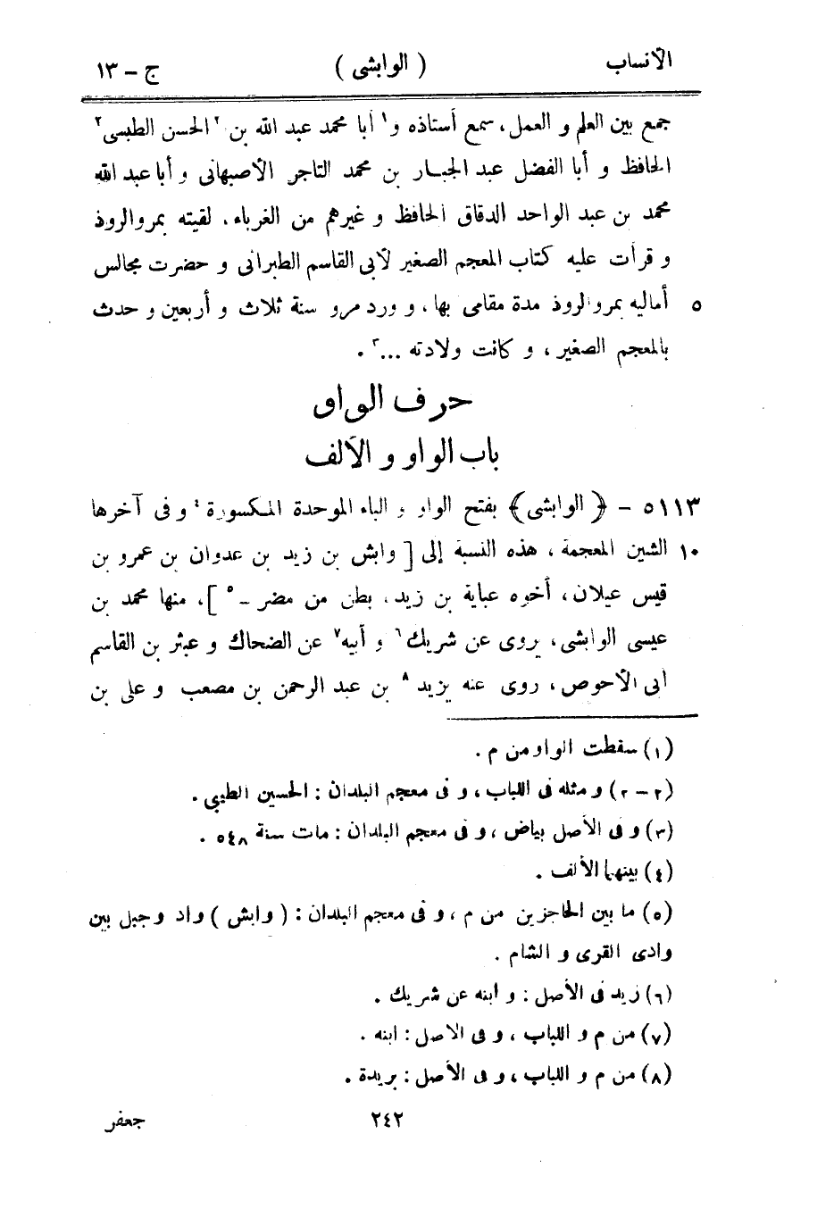 بفتح الواو والباء الموحدة المكسورة [4] وفي آخرها الشين المعجمة، هذه النسبة إلى [وابش بن زيد بن عدوان بن عمرو بن قيس عيلان، أخوه عباية بن زيد، بطن من مضر-[5]] ، منها محمد بن عيسى الوابشي، يروى عن شريك [6] وأبيه [7] عن الضحاك وعبثر بن القاسم أبى الأحوص، روى عنه يزيد [8] بن عبد الرحمن بن مصعب وعلى بن