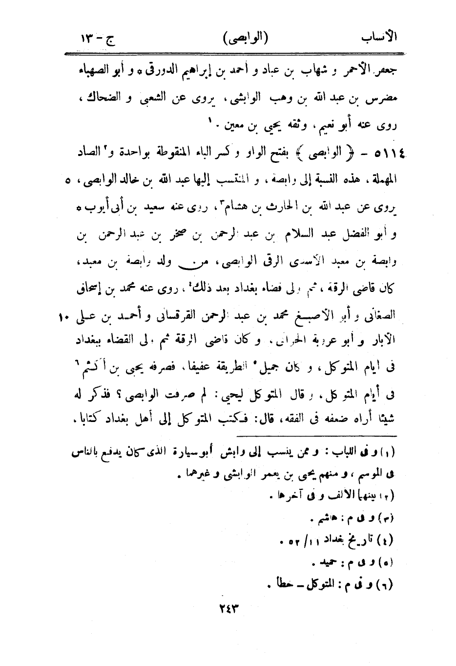 بفتح الواو وكسر الباء المنقوطة بواحدة و [2] الصاد المهملة، هذه النسبة إلى وابصة، والمنتسب إليها عبد الله بن خالد الوابصى، يروى عن عبد الله بن الحارث بن هشام [3] ، روى عنه سعيد بن أبى أيوب وأبو الفضل عبد السلام بن عبد الرحمن بن صخر بن عبد الرحمن بن وابصة بن معبد الأسدي الرقى الوابصى، من ولد وابصة بن معبد، كان قاضى الرقة، ثم ولى قضاء بغداد بعد ذلك [4] ، روى عنه محمد بن إسحاق الصغاني وأبو الأصبغ محمد بن عبد الرحمن القرقساني وأحمد بن على الأبار وأبو عروبة الحراني، وكان قاضى الرقة ثم ولى القضاء ببغداد في أيام المتوكل، وكان جميل [5] الطريقة عفيفا، فصرفه يحيى بن أكثم [6] في أيام المتوكل، وقال المتوكل ليحيى: لم صرفت الوابصى؟ فذكر له شيئا أراه ضعفه في الفقه، قال: فكتب المتوكل إلى أهل بغداد كتابا،