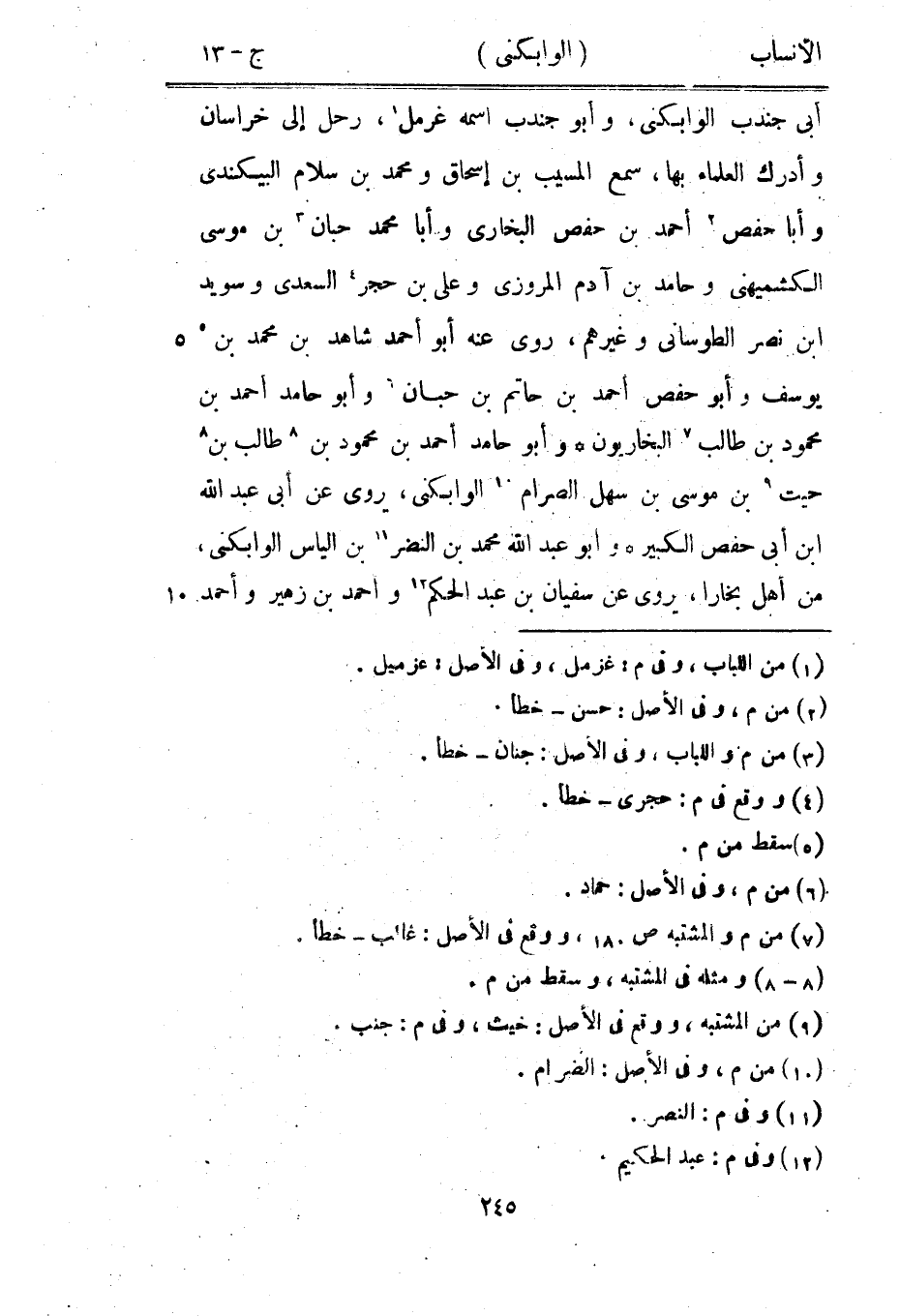 أبى جندب الوابكنى، وأبو جندب اسمه غرمل [1] ، رحل إلى خراسان وأدرك العلماء بها، سمع المسيب بن إسحاق ومحمد بن سلام البيكندي وأبا حفص [2] أحمد بن حفص البخاري وأبا محمد حبان [3] بن موسى الكشميهني وحامد بن آدم المروزي وعلى بن حجر [4] السعدي وسويد ابن نصر الطوسانى وغيرهم، روى عنه أبو أحمد شاهد بن محمد بن [5] يوسف وأبو حفص أحمد بن حاتم بن حبان [6] وأبو حامد أحمد بن محمود بن طالب [7] البخاريون وأبو حامد أحمد بن محمود بن [8] طالب بن [8] حيث [9] بن موسى بن سهل الصرام [10] الوابكنى، يروى عن أبى عبد الله ابن أبى حفص الكبير وأبو عبد الله محمد بن النضر [11] بن الياس الوابكنى، من أهل بخارا، يروى عن سفيان بن عبد الحكم [12] وأحمد بن زهير وأحمد