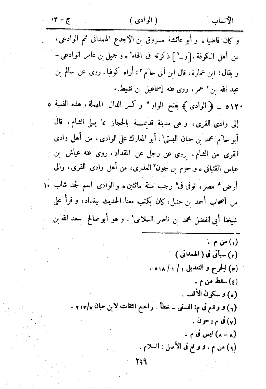 بفتح الواو [5] وكسر الدال المهملة، هذه النسبة إلى وادي القرى، وهي مدينة قديمة بالحجاز مما يلي الشام، قال أبو حاتم محمد بن حبان البستي [6] : أبو المعارك على الوادي، من أهل وادي القرى من الشام، يروى عن رجل عن المقداد، روى عنه عياش بن عباس القتباني وحزم بن جون [7] العذري، من أهل وادي القرى، والى أرض [8] مصر، توفى في [8] رجب سنة مائتين والوادي اسم لجد شاب من أصحاب أحمد بن حنبل، كان يكتب معنا الحديث ببغداد، وقرأ على شيخنا أبى الفضل محمد بن ناصر السلامي [9] ، وهو أبو صالح سعد الله بن