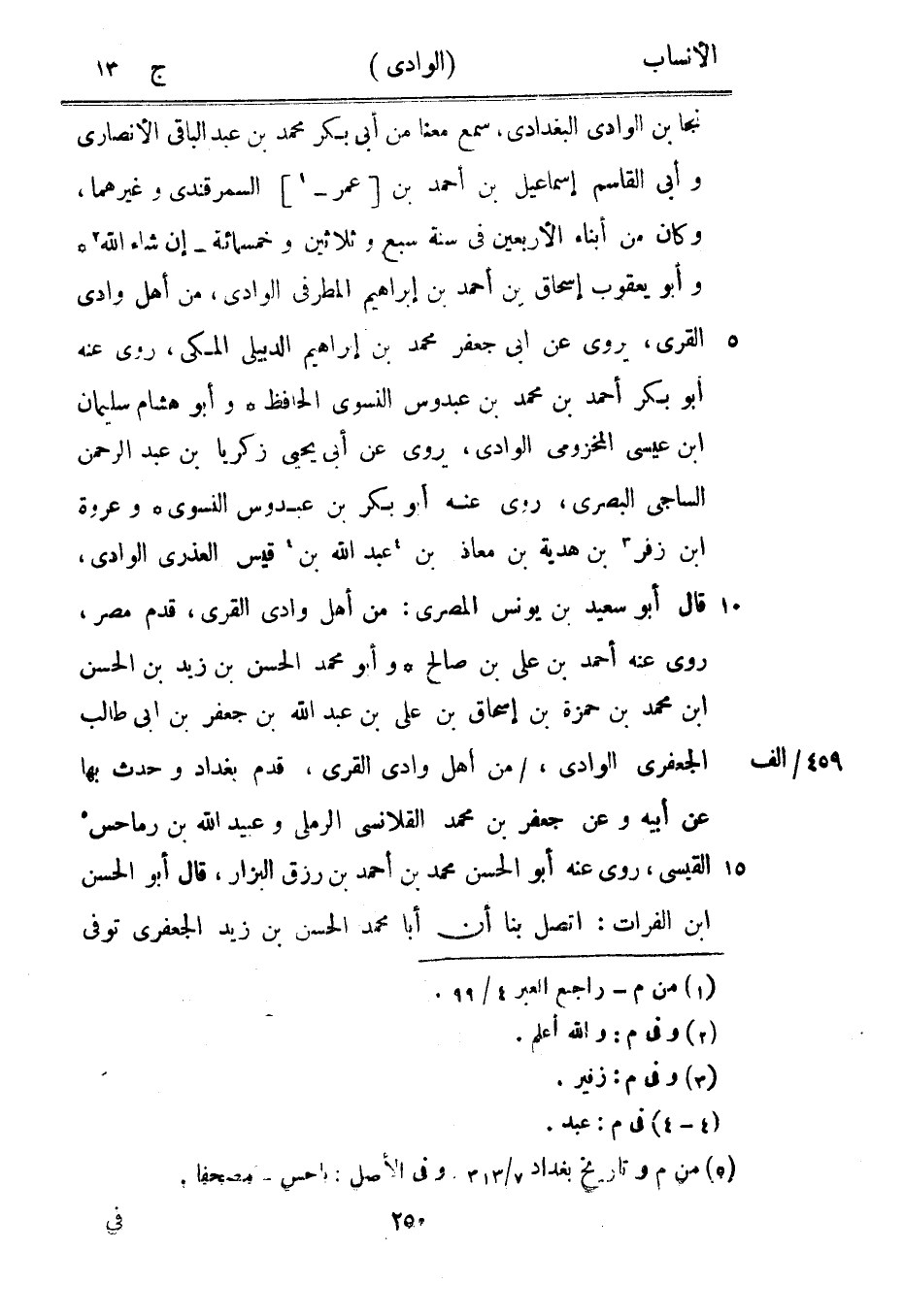 نجا بن الوادي البغدادي، سمع معنا من أبى بكر محمد بن عبد الباقي الأنصاري وأبى القاسم إسماعيل بن أحمد بن [عمر-[1]] السمرقندي وغيرهما، وكان من أبناء الأربعين في سنة سبع وثلاثين وخمسمائة- إن شاء الله [2] وأبو يعقوب إسحاق بن أحمد بن إبراهيم المطرفي الوادي، من أهل وادي القرى، يروى عن أبى جعفر محمد بن إبراهيم الدبيلي المكيّ، روى عنه أبو بكر أحمد بن محمد بن عبدوس النسوي الحافظ وأبو هشام سليمان ابن عيسى المخزومي الوادي، يروى عن أبى يحيى زكريا بن عبد الرحمن الساجي البصري، روى عنه أبو بكر بن عبدوس النسوي وعروة ابن زفر [3] بن هدية بن معاذ بن [4] عبد الله بن [4] قيس العذري الوادي، قال أبو سعيد بن يونس المصري: من أهل وادي القرى، قدم مصر، روى عنه أحمد بن على بن صالح وأبو محمد الحسن بن زيد بن الحسن ابن محمد بن حمزة بن إسحاق بن على بن عبد الله بن جعفر بن ابى طالب الجعفري الوادي،/ من أهل وادي القرى، قدم بغداد وحدث بها عن أبيه وعن جعفر بن محمد القلانسي الرمليّ وعبيد الله بن رماحس [5] القيسي، روى عنه أبو الحسن محمد بن أحمد بن رزق البزار، قال أبو الحسن ابن الفرات: اتصل بنا أن أبا محمد الحسن بن زيد الجعفري توفى