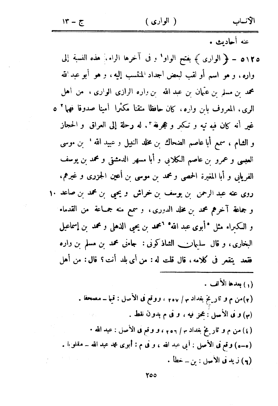 بفتح الواو [1] وفي آخرها الراء، هذه النسبة إلى وارة، وهو اسم أو لقب لبعض أجداد المنتسب إليه، وهو أبو عبد الله محمد بن مسلم بن عثمان بن عبد الله بن وارة الرازيّ الواري، من أهل الري، المعروف بابن وارة، كان حافظا متقنا مكثرا أمينا صدوقا فهما [2] غير أنه كان فيه تيه وتكبر وعجرفة [3] ، له رحلة إلى العراق والحجاز والشام، سمع أبا عاصم الضحاك بن مخلد النبيل وعبيد الله [4] بن موسى العبسيّ وعمرو بن عاصم الكلابي وأبا مسهر الدمشقيّ ومحمد بن يوسف الفريابي وأبا المغيرة الحمصي ومحمد بن موسى بن أعين الجزري وغيرهم، روى عنه عبد الرحمن بن يوسف بن خراش ويحيى بن محمد بن صاعد وجماعة آخرهم محمد بن مخلد الدوري، وسمع منه جماعة من القدماء والكبراء مثل [5] أبوي عبد الله [5] [6] محمد بن يحيى الذهلي ومحمد بن إسماعيل البخاري، وقال سليمان الشاذكوني: جاءني محمد بن مسلم بن وارة فقعد يتقعر في كلامه، قال قلت له: من أي بلد أنت؟ قال: من أهل