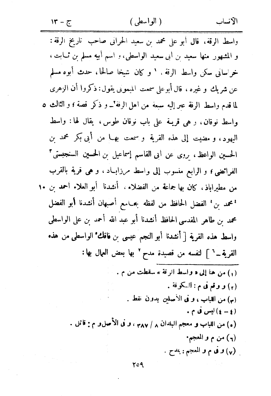 والمشهور منها سعيد بن أبى سعيد الواسطي، واسم أبيه مسلم بن ثابت، خراسانى سكن واسط الرقة، [1] وكان شيخا صالحا، حدث أبوه مسلم عن شريك وغيره، قال أبو على سمعت الميموني يقول: ذكروا أن الزهري لما قدم واسط الرقة عبر إليه سبعة من أهل الرقة [2]- وذكر قصة، والثالث واسط نوقان، وهي قرية على باب نوقان طوس، يقال لها: واسط اليهود، ومضيت إلى هذه القرية وسمعت بها من أبى بكر محمد بن الحسين الواعظ، يروى عن أبى القاسم إسماعيل بن الحسين السنجبستى [3] الفرائضى، والرابع منسوب إلى واسط مرزاباد، وهي قرية بالقرب من مطيراباذ، كان بها جماعة من الفضلاء، أنشدنا أبو العلاء أحمد بن [4] محمد بن [4] الفضل الحافظ من لفظه بجامع أصبهان أنشدنا أبو الفضل محمد بن طاهر المقدسي الحافظ أنشدنا أبو عبد الله أحمد بن على الواسطي واسط هذه القرية [أنشدنا أبو النجم عيسى بن فاقك [5] الواسطي من هذه القرية-[6]] لنفسه من قصيدة مدح [7] بها بعض العمال بها: