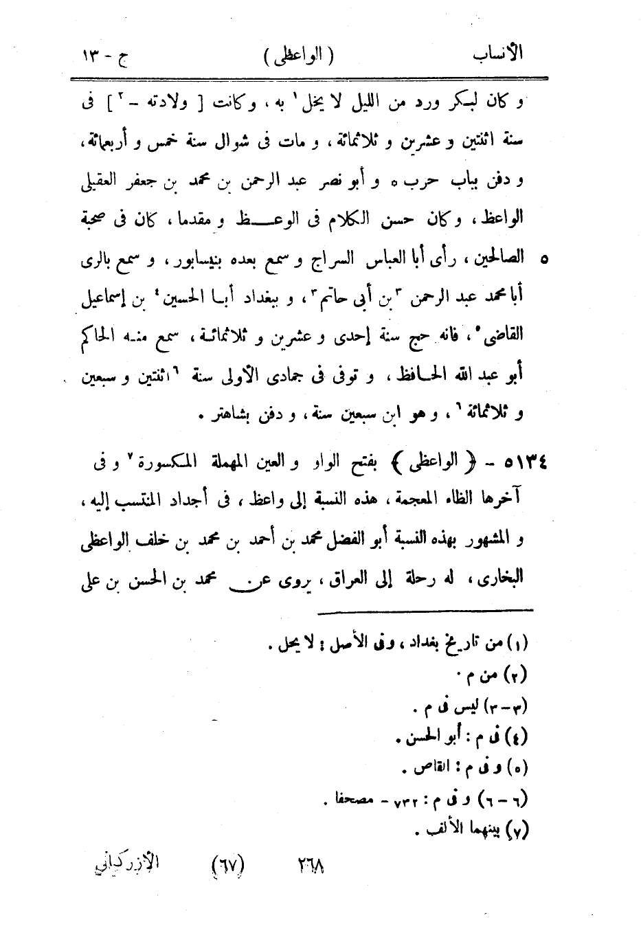 بفتح الواو والعين المهملة المكسورة [7] وفي آخرها الظاء المعجمة، هذه النسبة إلى واعظ، في أجداد المنتسب إليه، والمشهور بهذه النسبة أبو الفضل محمد بن أحمد بن محمد بن خلف الواعظي البخاري، له رحلة إلى العراق، يروى عن محمد بن الحسن بن على