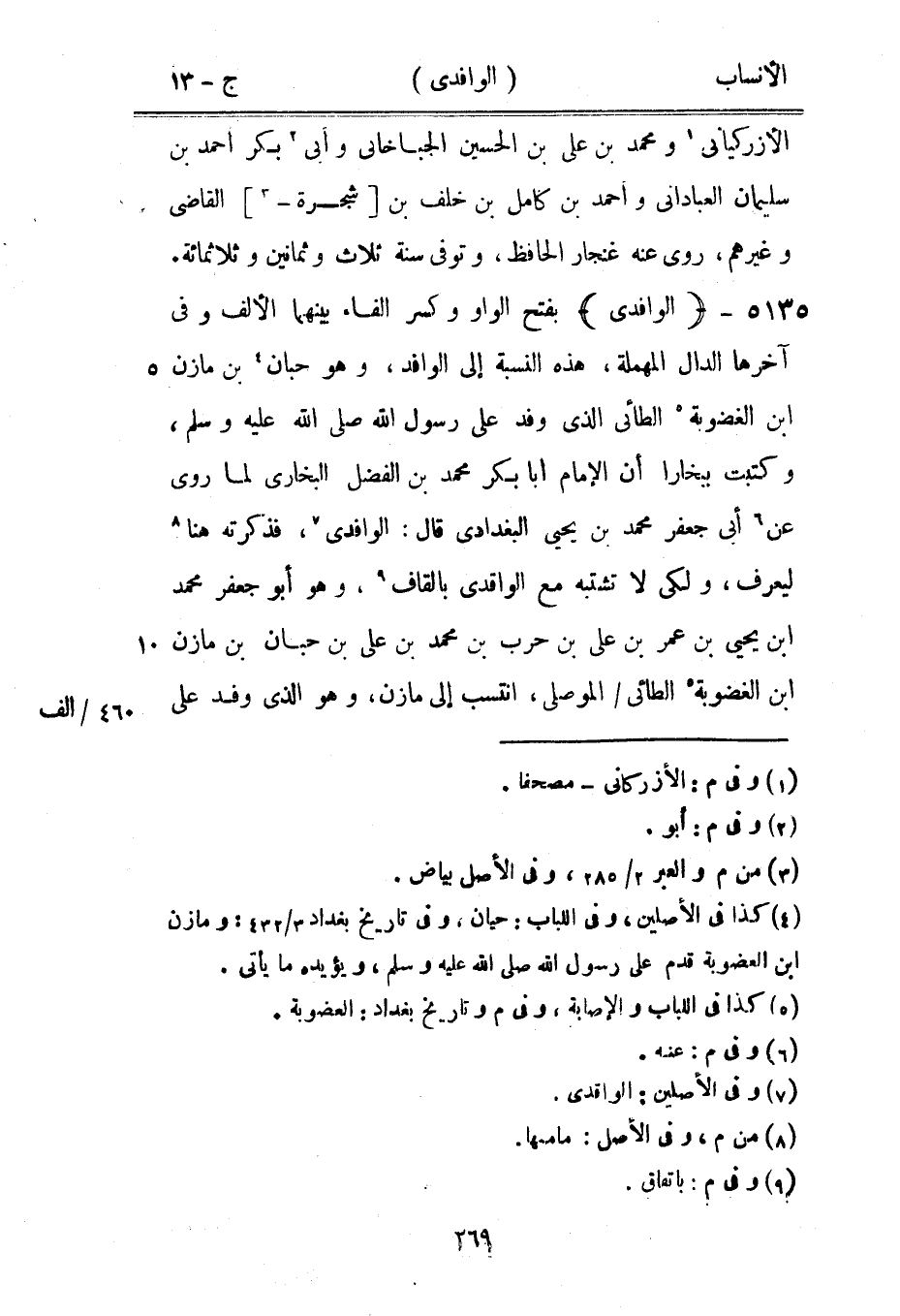بفتح الواو وكسر الفاء بينهما الألف وفي آخرها الدال المهملة، هذه النسبة إلى الوافد، وهو حبان [4] بن مازن ابن الغضوبة [5] الطائي الّذي وفد على رسول الله صلى الله عليه وسلم، وكتبت ببخارا أن الإمام أبا بكر محمد بن الفضل البخاري لما روى عن [6] أبى جعفر محمد بن يحيى البغدادي قال: الوافدى [7] ، فذكرته هنا [8] ليعرف، ولكي لا تشتبه مع الواقدي بالقاف [9] ، وهو أبو جعفر محمد ابن يحيى بن عمر بن على بن حرب بن محمد بن على بن حبان بن مازن ابن الغضوبة [5] الطائي/ الموصلي، انتسب إلى مازن، وهو الّذي وفد على