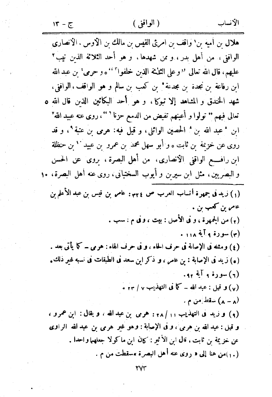 هلال بن أمية بن [1] واقف بن امرئ القيس بن مالك بن الأوس، الأنصاري الواقفي، من أهل بدر، وممن شهدها، وهو أحد الثلاثة الذين تيب [2] عليهم، قال الله تعالى وَعَلَى الثَّلاثَةِ الَّذِينَ خُلِّفُوا [3] 9: 118 وحرمي [4] بن عبد الله ابن رفاعة بن نجدة بن مجدعة [5] بن كعب بن سالم وهو الواقف، الواقفي، شهد الخندق والمشاهد إلا تبوكا، وهو أحد البكاءين الذين قال الله تعالى فيهم تَوَلَّوْا وَأَعْيُنُهُمْ تَفِيضُ من الدَّمْعِ حَزَناً [6] 9: 92، روى عنه عبيد الله [7] ابن [8] عبد الله بن [8] الحصين الوائلى، وقيل فيه: هرمي بن عتبة [9] ، وقد روى عن خزيمة بن ثابت وأبو سهل محمد بن عمرو بن عبيد [10] بن حنظلة ابن رافع الواقفي الأنصاري، من أهل البصرة، يروى عن الحسن والبصريين، مثل ابن سيرين وأيوب السختياني، روى عنه أهل البصرة،