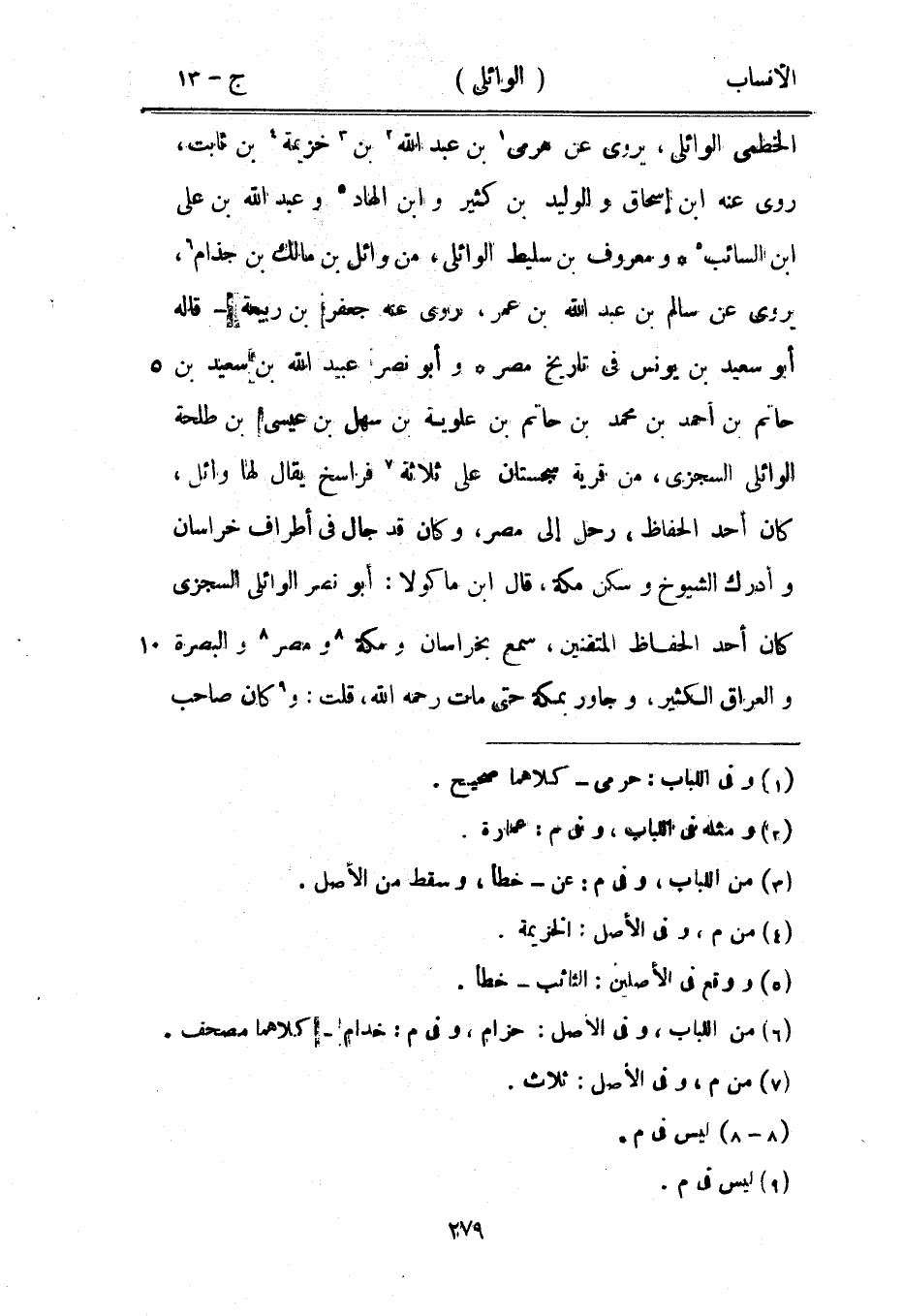 الخطميّ الوائلى، يروى عن هرمي [1] بن عبد الله [2] بن [3] خزيمة [4] بن ثابت، روى عنه ابن إسحاق والوليد بن كثير وابن الهاد [5] وعبد الله بن على ابن السائب [5] ومعروف بن سليط الوائلى، من وائل بن مالك بن جذام [6] ، يروى عن سالم بن عبد الله بن عمر، روى عنه جعفر بن ربيعة- قاله أبو سعيد بن يونس في تاريخ مصر وأبو نصر عبيد الله بن سعيد بن حاتم بن أحمد بن محمد بن حاتم بن علوية بن سهل بن عيسى بن طلحة الوائلى السجزى، من قرية سجستان على ثلاثة [7] فراسخ يقال لها وائل، كان أحد الحفاظ، رحل إلى مصر، وكان قد جال في أطراف خراسان وأدرك الشيوخ وسكن مكة، قال ابن ماكولا: أبو نصر الوائلى السجزى كان أحد الحفاظ المتقنين، سمع بخراسان ومكة [8] ومصر [8] والبصرة والعراق الكثير، وجاور بمكة حتى مات رحمه الله، قلت: و [9] كان صاحب