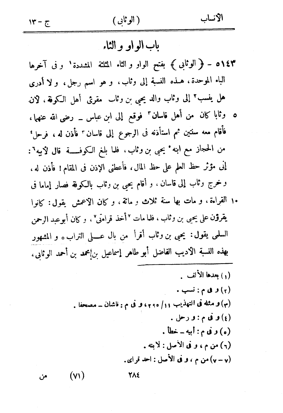 إني مؤثر حظ العلم على حظ المال، فأعطنى الإذن في المقام! فأذن له، وخرج وثاب إلى قاسان، وأقام يحيى بن وثاب بالكوفة فصار إماما في القراءة، ومات بها سنة ثلاث ومائة، وكان الأعمش يقول: كانوا يقرءون على يحيى بن وثاب، فلما مات [7] أخذ قراءتي [7] ، وكان أبو عبد الرحمن السلمي يقول: يحيى بن وثاب أقرأ من بال على التراب والمشهور بهذه النسبة الأديب الفاضل أبو طاهر إسماعيل بن محمد بن أحمد الوثابى،