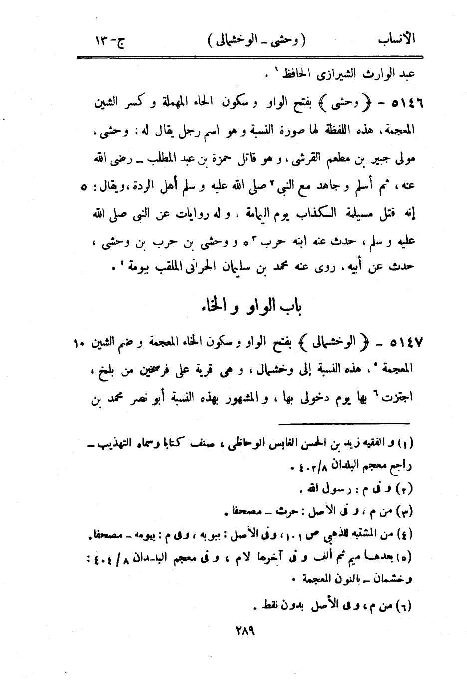 بفتح الواو وسكون الحاء المهملة وكسر الشين المعجمة، هذه اللفظة لها صورة النسبة وهو اسم رجل يقال له: وحشي، مولى جبير بن مطعم القرشي، وهو قاتل حمزة بن عبد المطلب- رضى الله عنه، ثم أسلم وجاهد مع النبي [2] صلى الله عليه وسلم أهل الردة، ويقال: