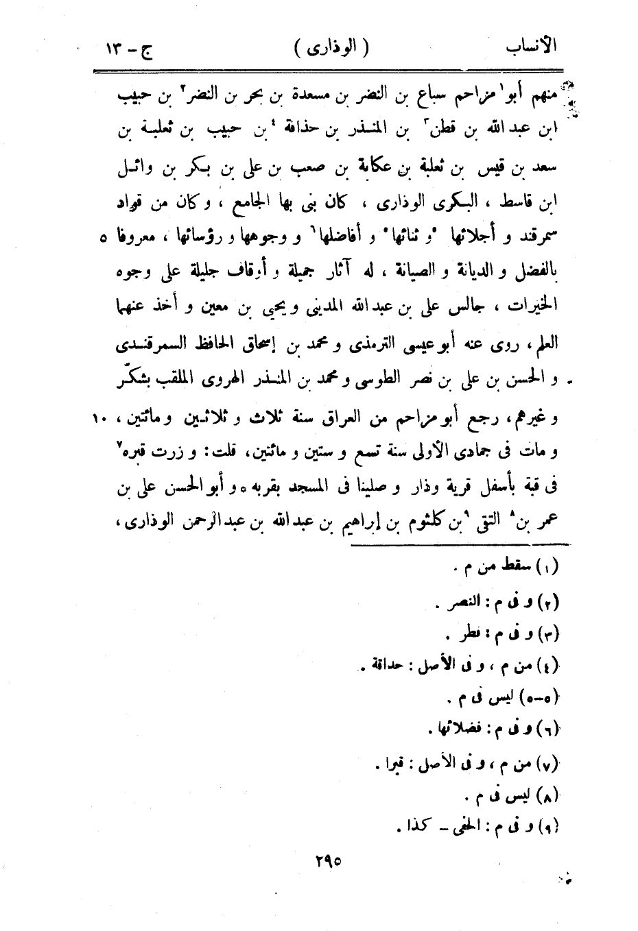منهم أبو [1] مزاحم سباع بن النضر بن مسعدة بن بحر بن النضر [2] بن حبيب ابن عبد الله بن قطن [3] بن المنذر بن حذافة [4] بن حبيب بن ثعلبة بن سعد بن قيس بن ثعلبة بن عكابة بن صعب بن على بن بكر بن وائل ابن قاسط، البكري الوذارى، كان بنى بها الجامع، وكان من قواد سمرقند وأجلائها [5] وثنائها [5] وأفاضلها [6] ووجوهها ورؤسائها، معروفا بالفضل والديانة والصيانة، له آثار جميلة وأوقاف جليلة على وجوه الخيرات، جالس على بن عبد الله المديني ويحيى بن معين وأخذ عنهما العلم، روى عنه أبو عيسى الترمذي ومحمد بن إسحاق الحافظ السمرقندي والحسن بن على بن نصر الطوسي ومحمد بن المنذر الهروي الملقب بشكّر وغيرهم، رجع أبو مزاحم من العراق سنة ثلاث وثلاثين ومائتين، ومات في جمادى الأولى سنة تسع وستين ومائتين، قلت: وزرت قبره [7] في قبة بأسفل قرية وذار وصلينا في المسجد بقربة وأبو الحسن على بن عمر بن [8] التقى [9] بن كلثوم بن إبراهيم بن عبد الله بن عبد الرحمن الوذارى،