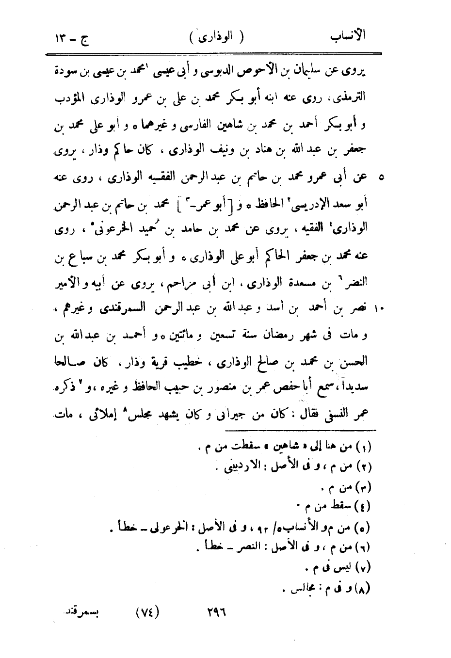 يروى عن سليمان بن الأحوص الدبوسي وأبى عيسى [1] محمد بن عيسى بن سودة الترمذي، روى عنه ابنه أبو بكر محمد بن على بن عمرو الوذارى المؤدب وأبو بكر أحمد بن محمد بن شاهين الفارسي وغيرهما وابو على محمد بن جعفر بن عبد الله بن هناد بن ونيف الوذارى، كان حاكم وذار، يروى عن أبى عمرو محمد بن حاتم بن عبد الرحمن الفقيه الوذارى، روى عنه أبو سعد الإدريسي [2] الحافظ و [أبو عمر-[3]] محمد بن حاتم بن عبد الرحمن الوذارى [4] الفقيه، يروى عن محمد بن حامد بن حميد الخرعونى [5] ، روى عنه محمد بن جعفر الحاكم أبو على الوذارى وأبو بكر محمد بن سباع بن النضر [6] بن مسعدة الوذارى، ابن أبى مزاحم، يروى عن أبيه والأمير نصر بن أحمد بن أسد وعبد الله بن عبد الرحمن السمرقندي وغيرهم، ومات في شهر رمضان سنة تسعين ومائتين وأحمد بن عبد الله بن الحسن بن محمد بن صالح الوذارى، خطيب قرية وذار، كان صالحا سديدا، سمع أبا حفص عمر بن منصور بن حبيب الحافظ وغيره، و [7] ذكره عمر النسفي فقال: كان من جيراني وكان يشهد مجلس [8] إملائي، مات