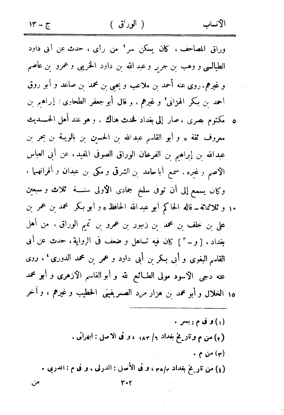 وراق المصاحف، كان يسكن سرمن رأى [1] ، حدث عن أبى داود الطيالسي ووهب بن جرير وعبد الله بن داود الخريبى وعمرو بن عاصم وغيرهم، روى عنه أحمد بن ملاعب ويحيى بن محمد بن صاعد وأبو روق أحمد بن بكر الهزانى [2] وغيرهم، وقال أبو جعفر الطحاوي: إبراهيم بن مكتوم بصرى، صار إلى بغداد فحدث هناك، وهو عند أهل الحديث معروف ثقة وأبو القاسم عبد الله بن الحسين بن بالوية بن بحر بن عبد الله بن إبراهيم بن الفرخان الوراق الصوفي المفيد، عن أبى العباس الأصم وغيره، سمع أبا حامد بن الشرقي، ومكي بن عبدان وأقرانهما، وكان يسمع إلى أن توفى سلخ جمادى الأولى سنة ثلاث وسبعين وثلاثمائة- قاله الحاكم أبو عبد الله الحافظ وأبو بكر محمد بن عمر بن على بن خلف بن محمد بن زنبور بن عمرو بن تميم الوراق، من أهل بغداد، [و-[3]] كان فيه تساهل وضعف في الرواية، حدث عن أبى القاسم البغوي وأبى بكر بن أبى داود وعمر بن محمد الدوري [4] ، روى عنه دجى الأسود مولى الطائع للَّه وأبو القاسم الأزهري وأبو محمد الخلال وأبو محمد بن هزارمرد الصريفيني الخطيب وغيرهم، وآخر