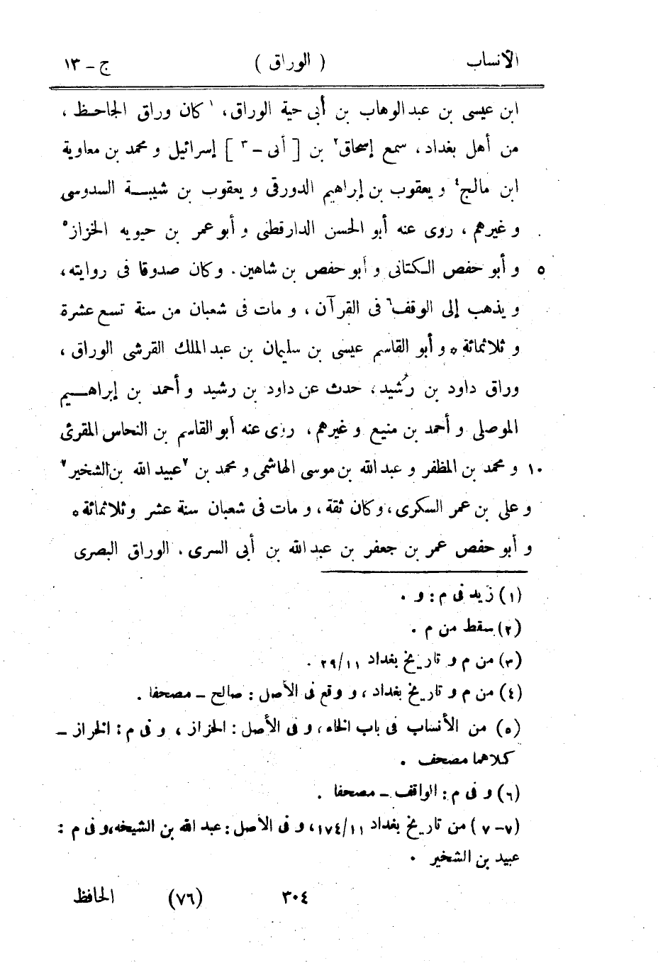 ابن عيسى بن عبد الوهاب بن أبى حية الوراق، [1] كان وراق الجاحظ، من أهل بغداد، سمع إسحاق [2] بن [أبى-[3]] إسرائيل ومحمد بن معاوية ابن مالج [4] ويعقوب بن إبراهيم الدورقي ويعقوب بن شيبة السدوسي وغيرهم، روى عنه أبو الحسن الدارقطنيّ وأبو عمر بن حيويه الخزاز [5] وأبو حفص الكتاني وأبو حفص بن شاهين، وكان صدوقا في روايته، ويذهب إلى الوقف [6] في القرآن، ومات في شعبان من سنة تسع عشرة وثلاثمائة وأبو القاسم عيسى بن سليمان بن عبد الملك القرشي الوراق، وراق داود بن رشيد، حدث عن داود بن رشيد وأحمد بن إبراهيم الموصلي وأحمد بن منيع وغيرهم، روى عنه أبو القاسم بن النحاس المقرئ ومحمد بن المظفر وعبد الله بن موسى الهاشمي ومحمد بن [7] عبيد الله بن الشخير [7] وعلى بن عمر السكرى، وكان ثقة، ومات في شعبان سنة عشر وثلاثمائة وأبو حفص عمر بن جعفر بن عبد الله بن أبى السري، الوراق البصري